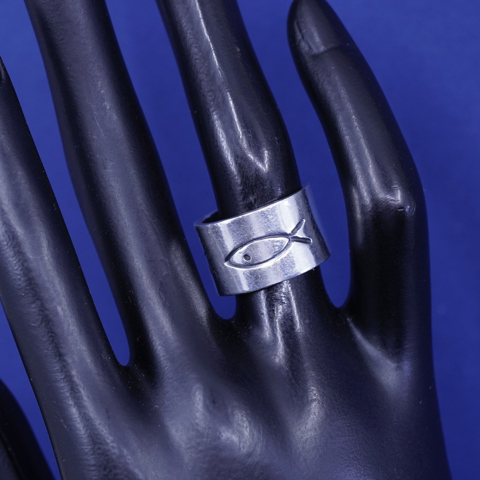 как выглядит Size 5.5, vintage Sterling silver handmade ring, wide 925 prayer band with fish фото