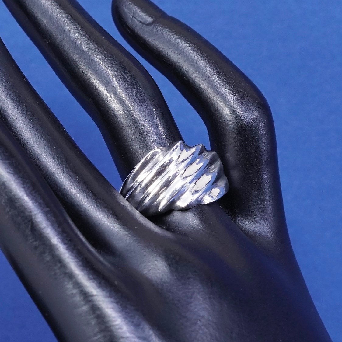 Size 9, vtg Sterling silver handmade ribbed ring, 925 statement ring w/ wave