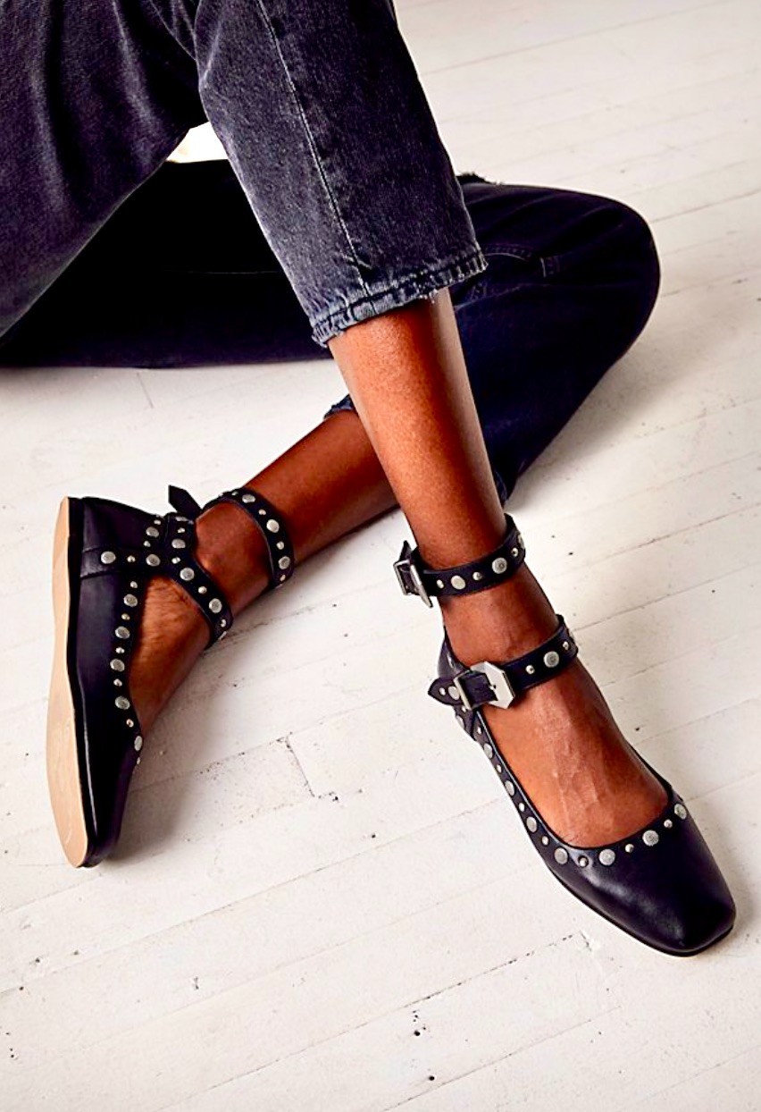 Free People Mystic Mary Jane Double Buckle Flat Black Leather Studded 9.5 NEW