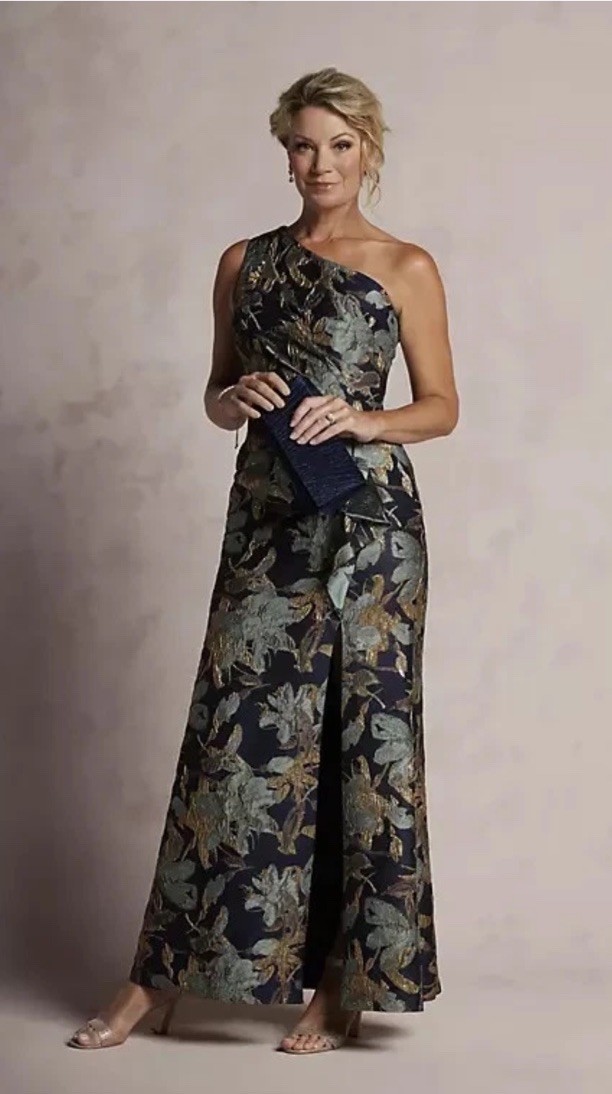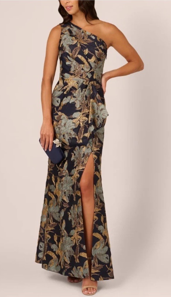 Adrianna Papell One Shoulder Jacquard Gown sz 8 Blue Gold New