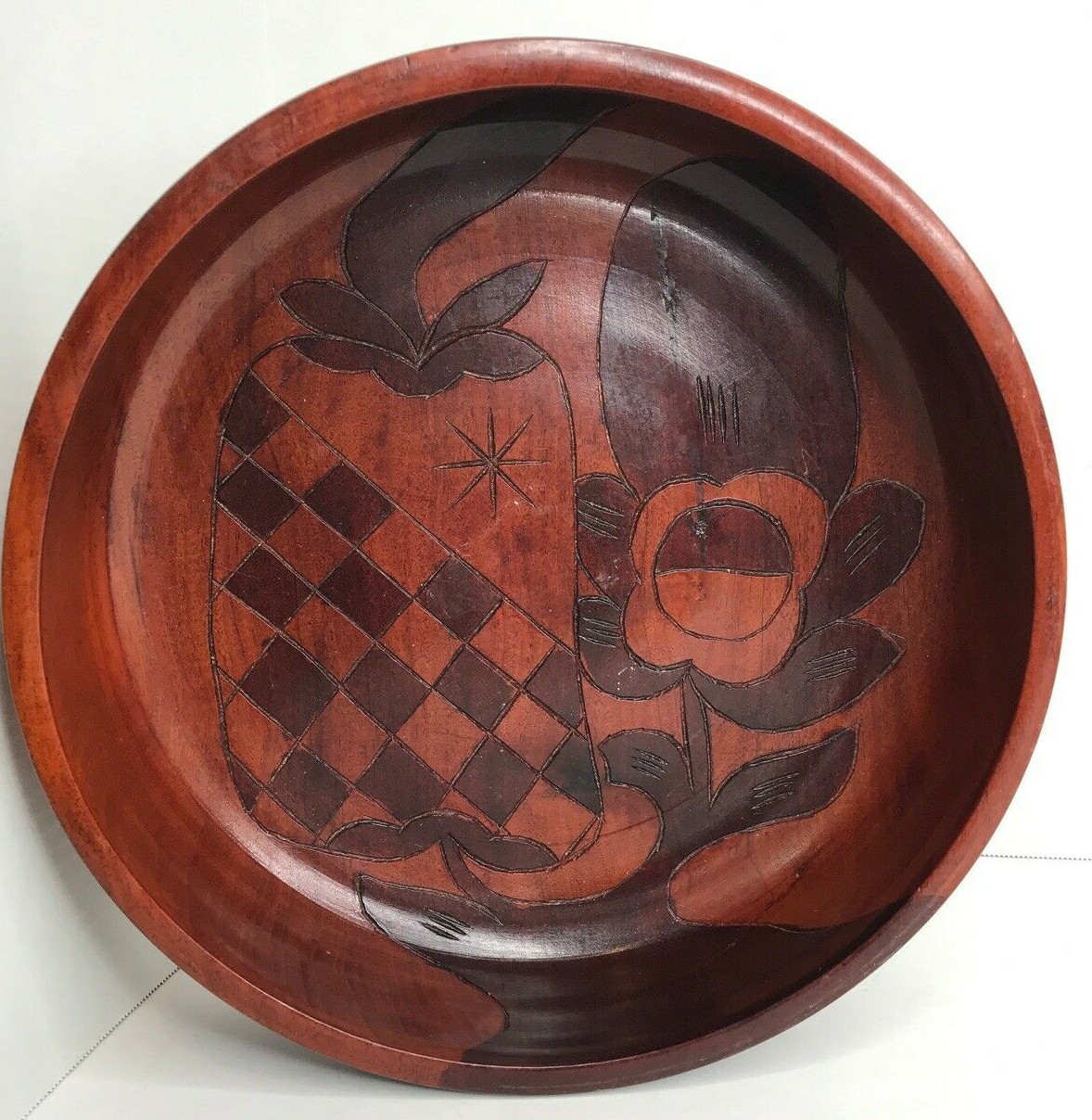 Vintage Hand Carved Wood Large Bowl Inlay Flowers Fruit 11.5 Folk Art EUC