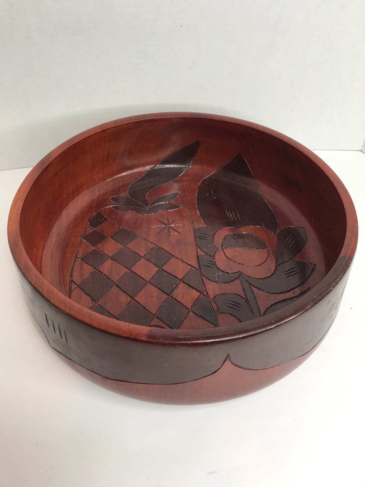 • Vintage Hand Carved Wood Large Bowl Inlay Flowers Fruit 11.5" Folk Art EUC