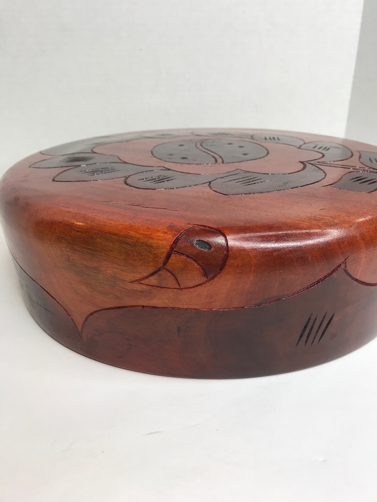 как выглядит Vintage Hand Carved Wood Large Bowl Inlay Flowers Fruit 11.5" Folk Art EUC фото