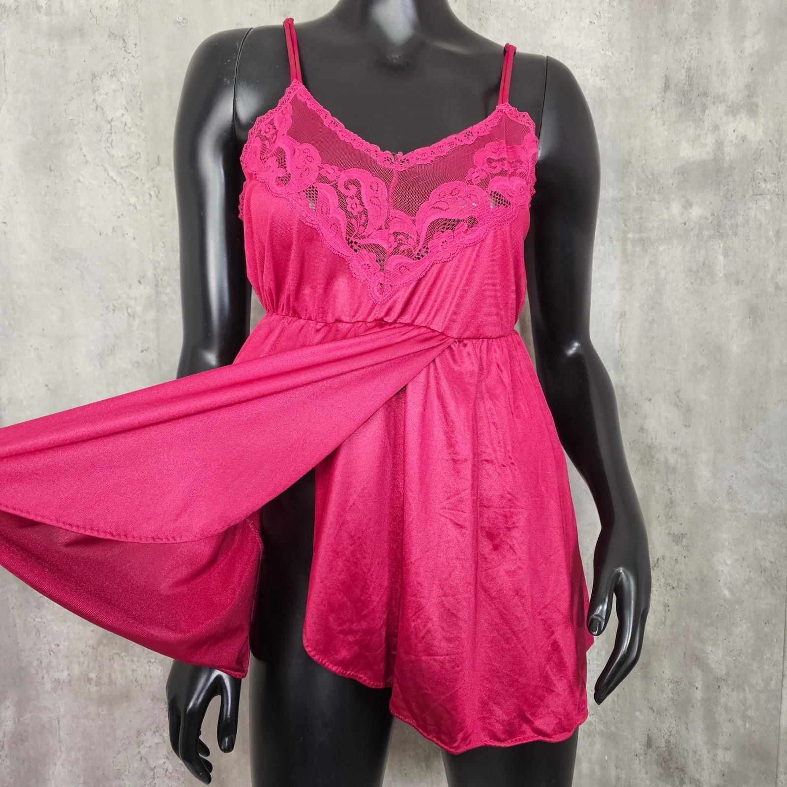 как выглядит Vintage 80s Texsheen Magenta Nylon Lace Babydoll Nightie Lingerie Sleepwear M фото