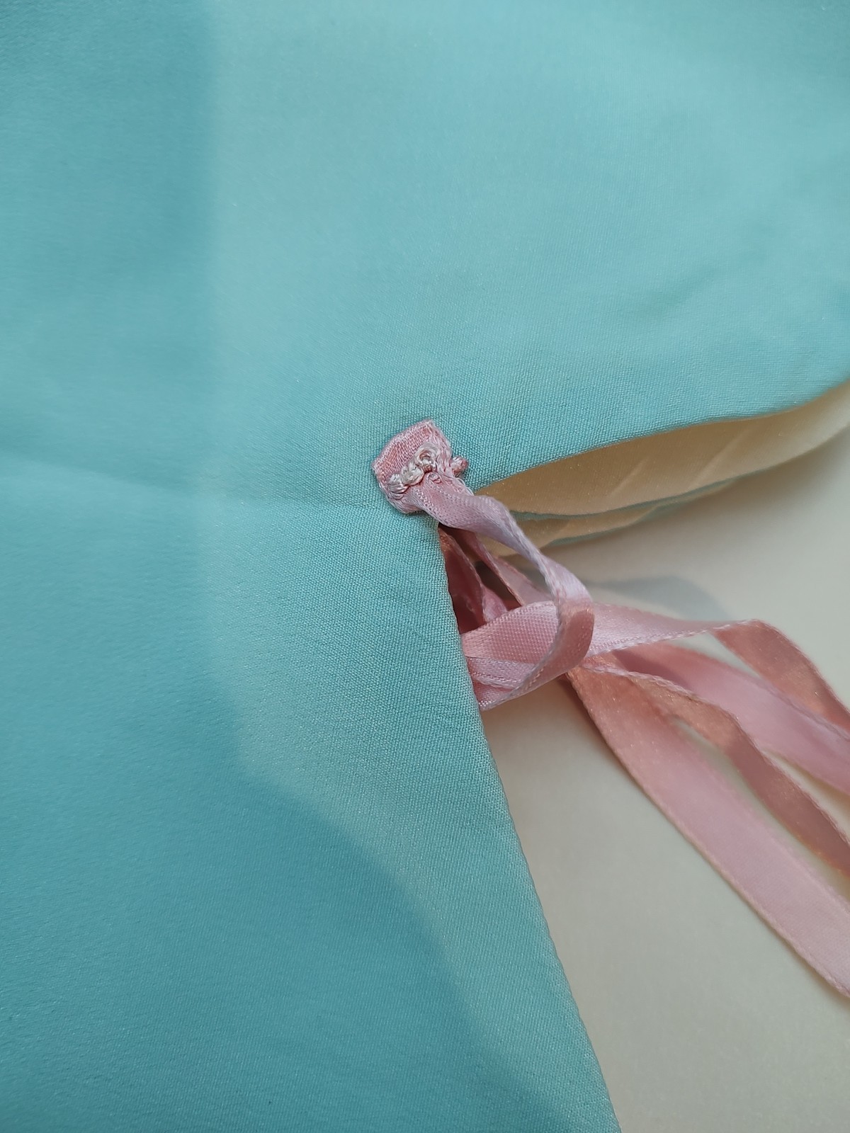 как выглядит VTG Baby Bed Jacket Aqua Satin Rayon w/ Pink Embroidery 1940s 50s Reborn Doll фото