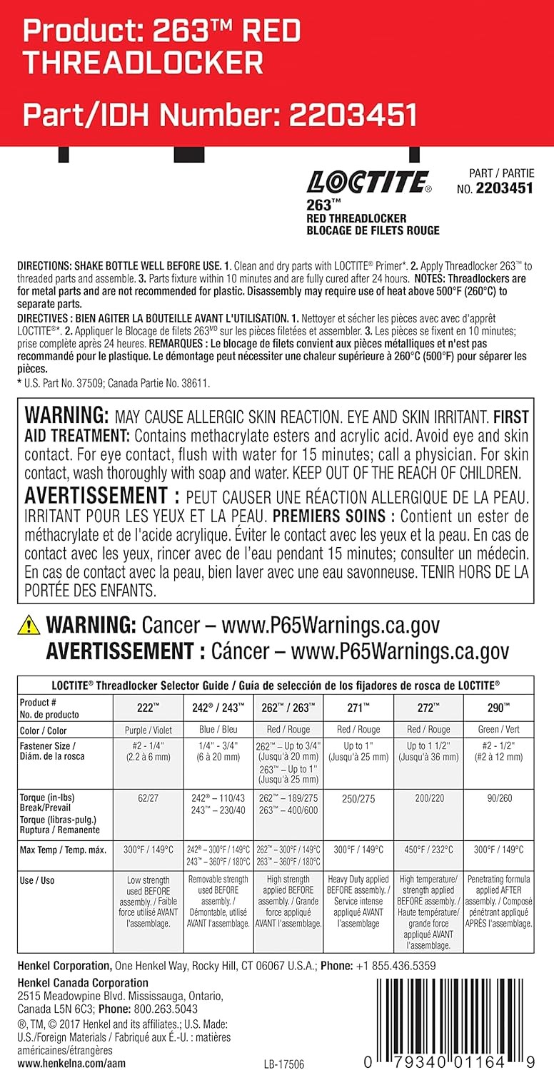 LOCTITE 263 Automotive Threadlocker Red High Strength 6 ml, 1 Pack,