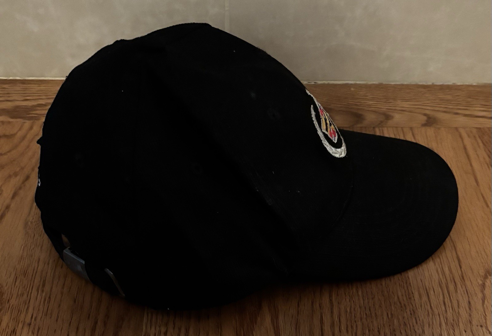 как выглядит Cadillac Embroidered Black Baseball Cap w/ Multiple Logos Adjustable Strap Used фото