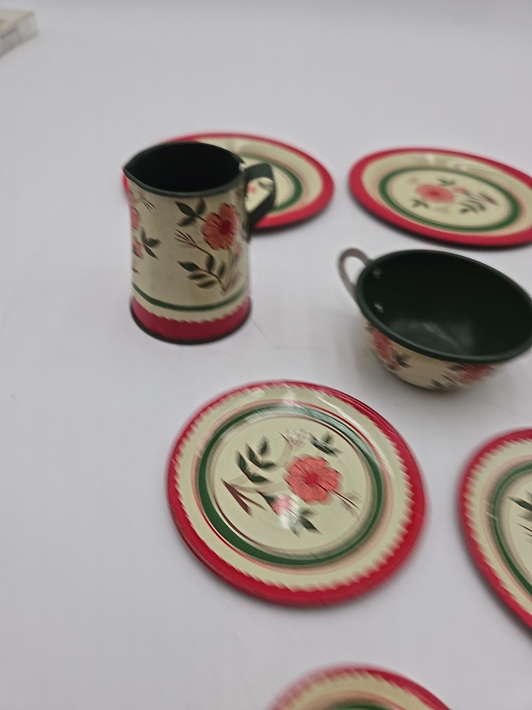 Vtg Ohio Tin Children Floral Kitchen 19 Pc 4 Plates 1 Pot 1 Pitcher 1 Bowl 4 Cup