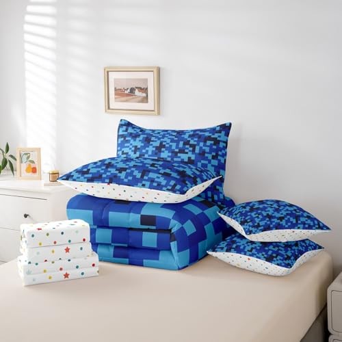 Navy Blue Camouflage 7Pcs Comforter Set Size,Geometric Checked Twin Blue Dark