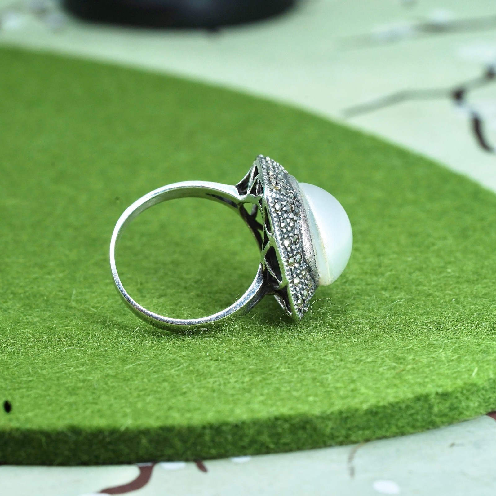 Size 11.25, Vintage sterling 925 silver handmade ring with faux pearl marcasite