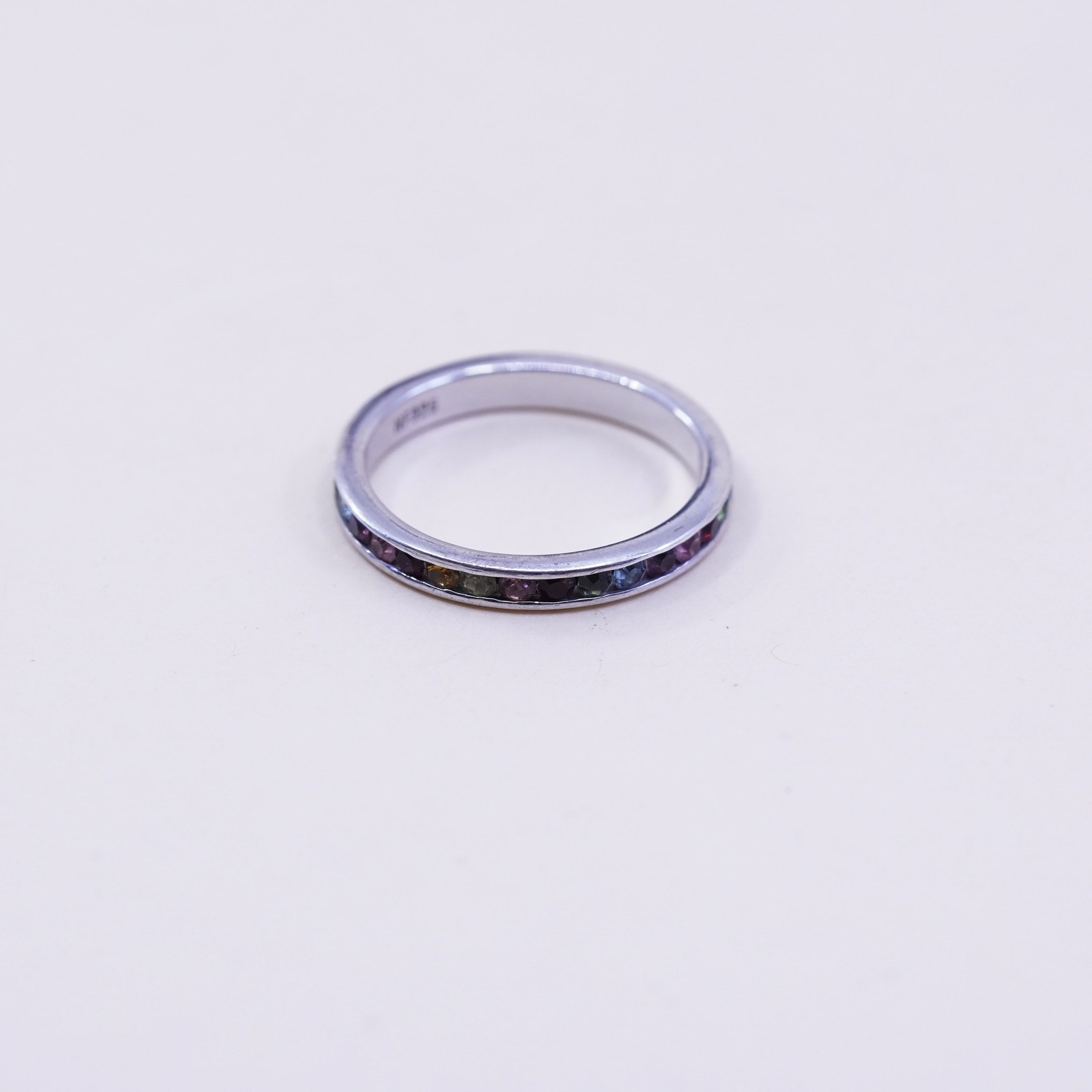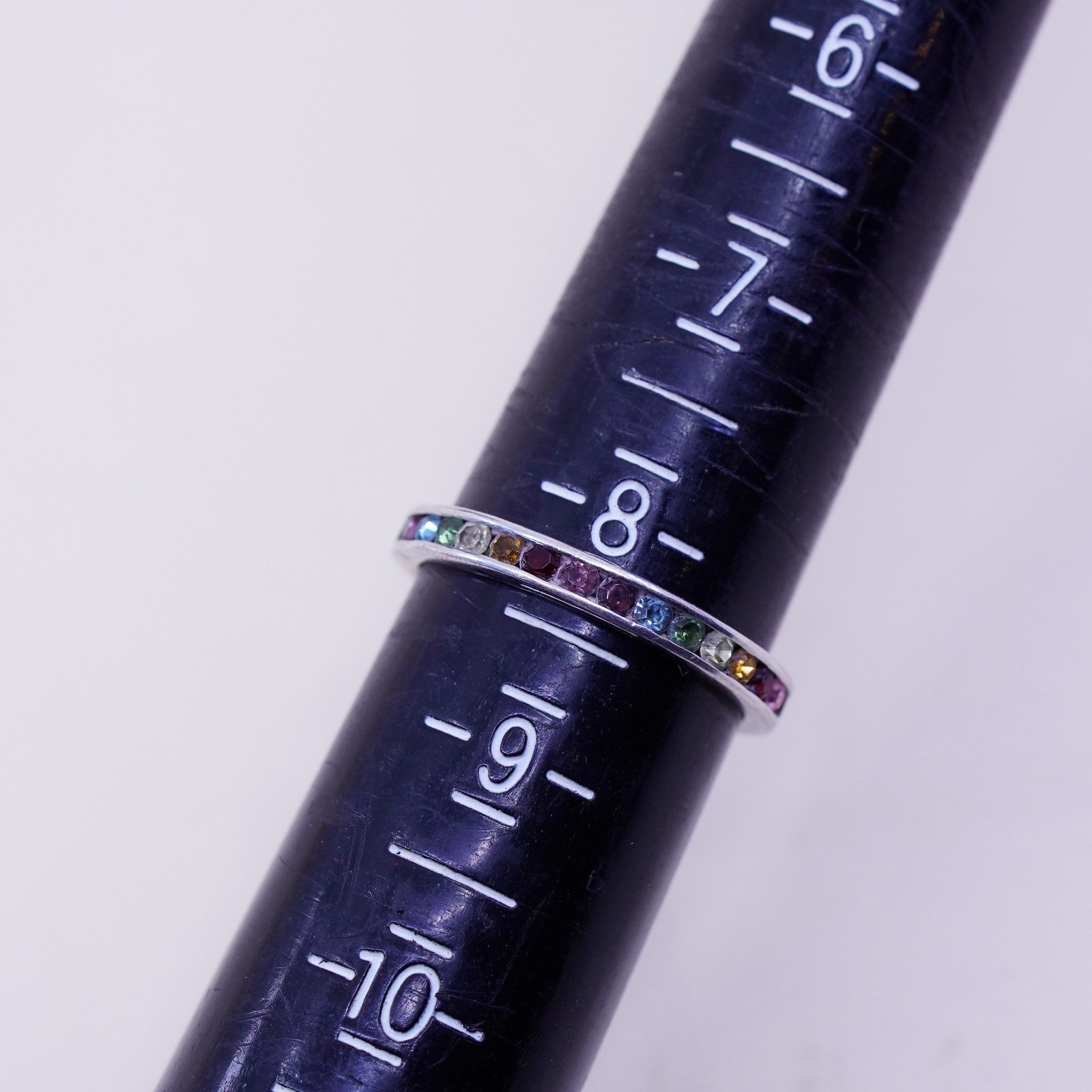 Size 8.25, Sterling 925 silver stackable ring, wedding band with colorful CZ