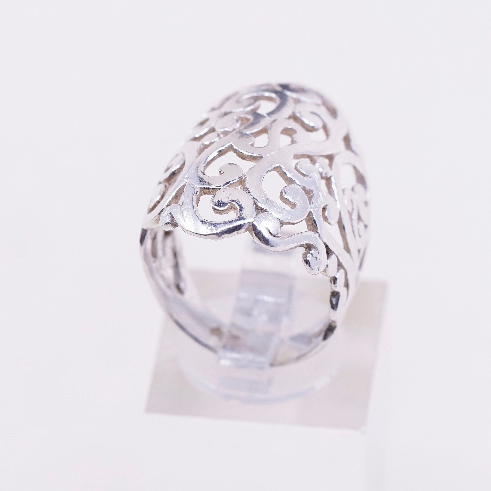 sz 5.5, vtg Sterling silver handmade ring, 925 wide band w/ Filigree swirl