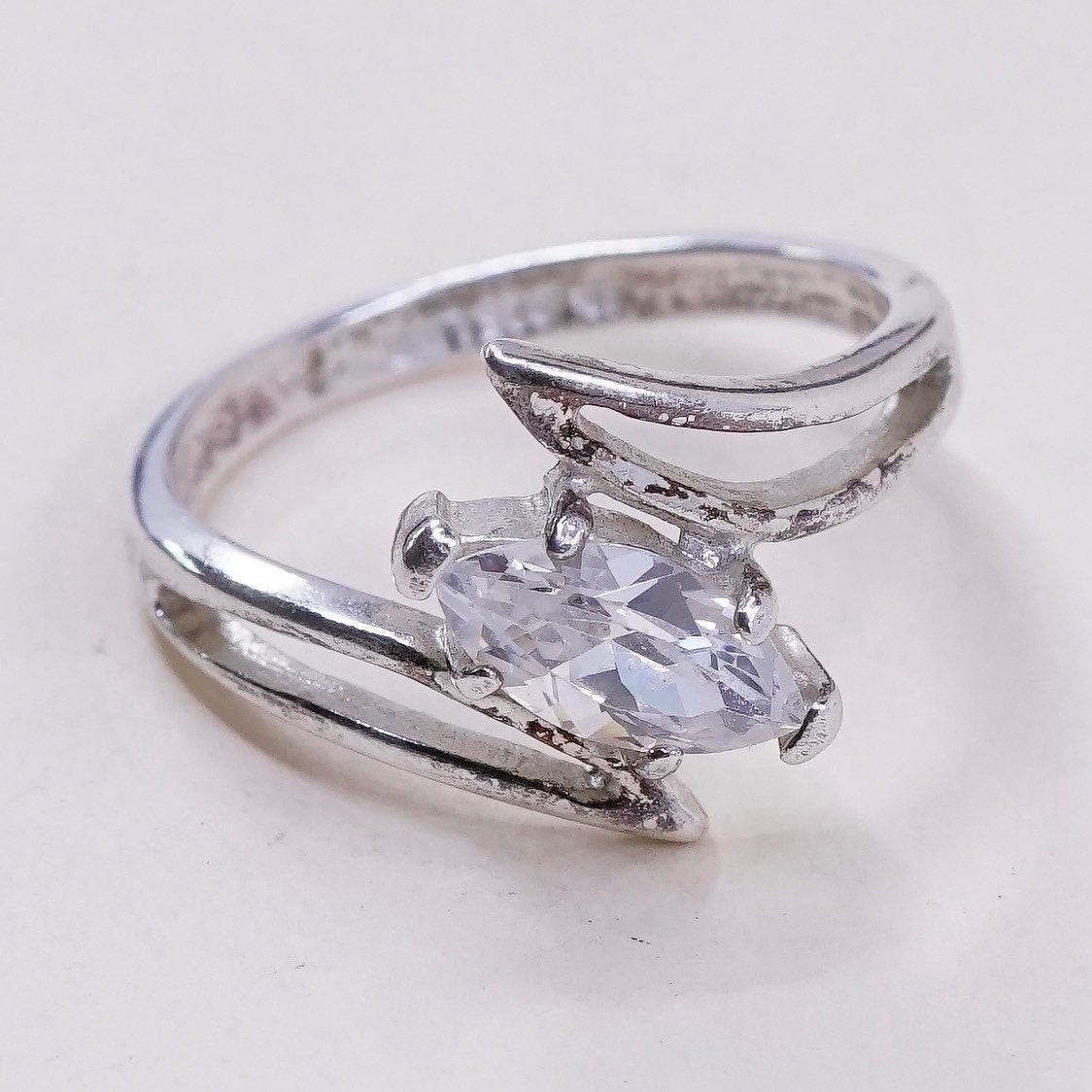 sz 8, vtg sterling silver handmade ring, engagement ring w/ Marquise cz