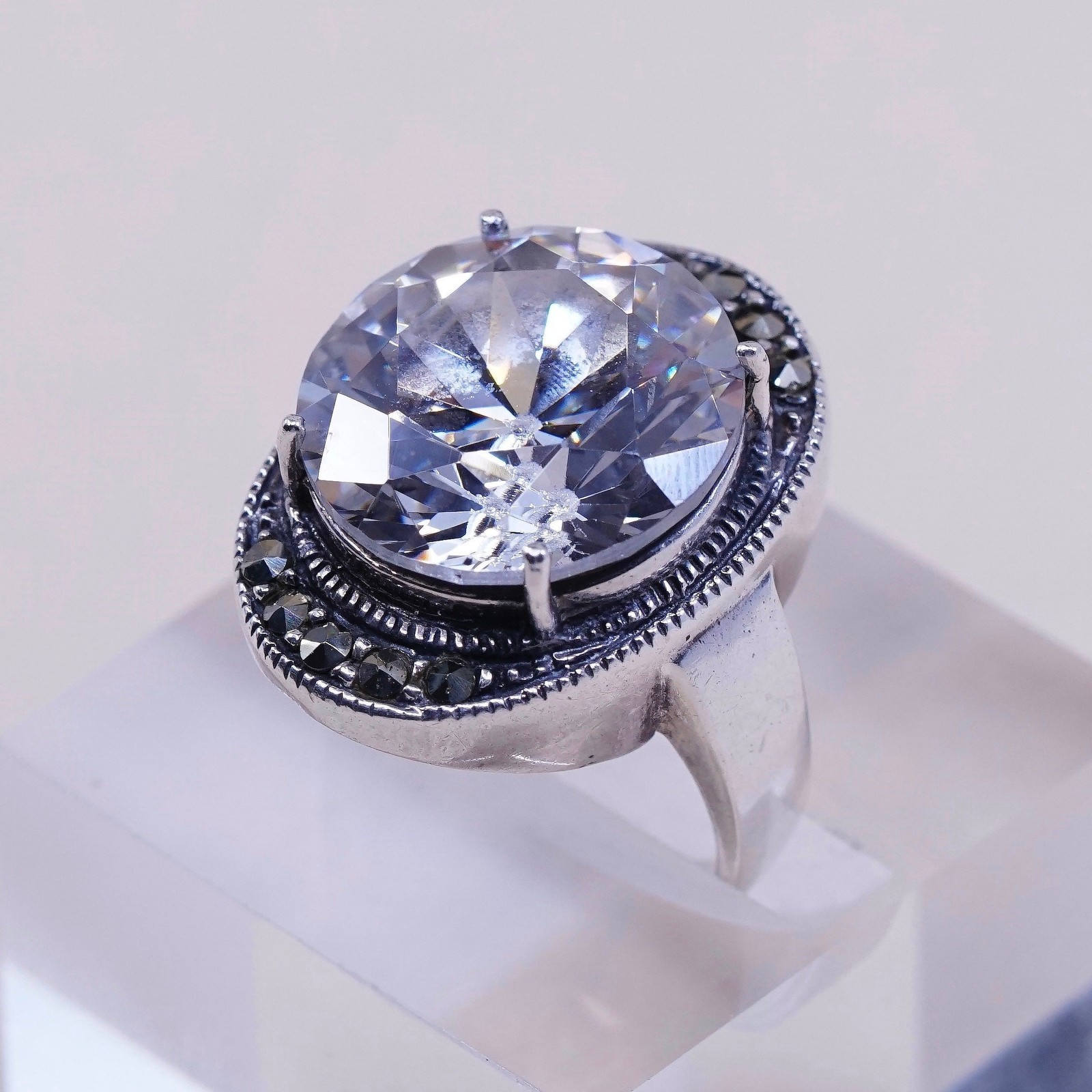 как выглядит Size 7, vintage Sterling silver handmade cocktail ring with CZ and marcasite фото