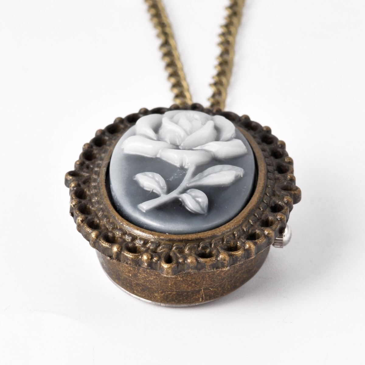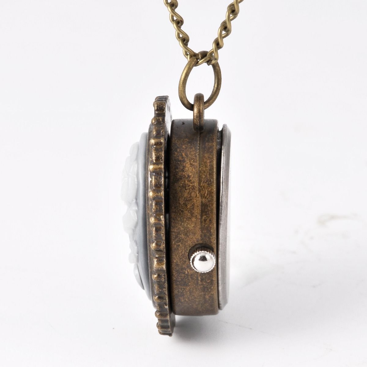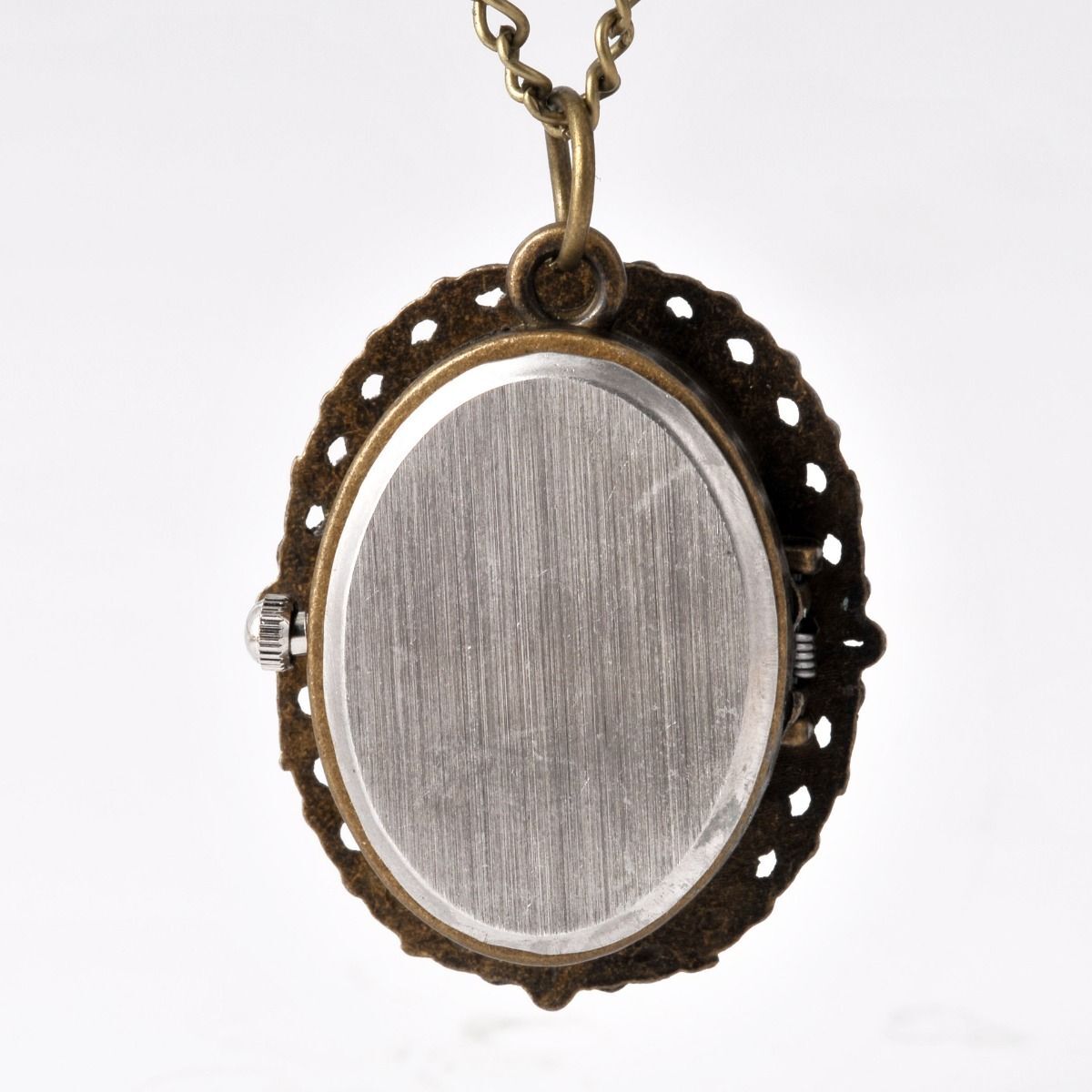 Small Pocket Watch Bronze Oval Flower Quartz Watch Long Necklace Pendant Watch