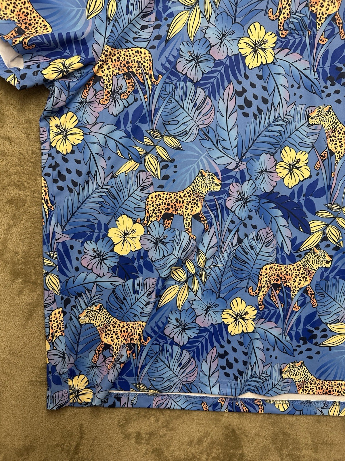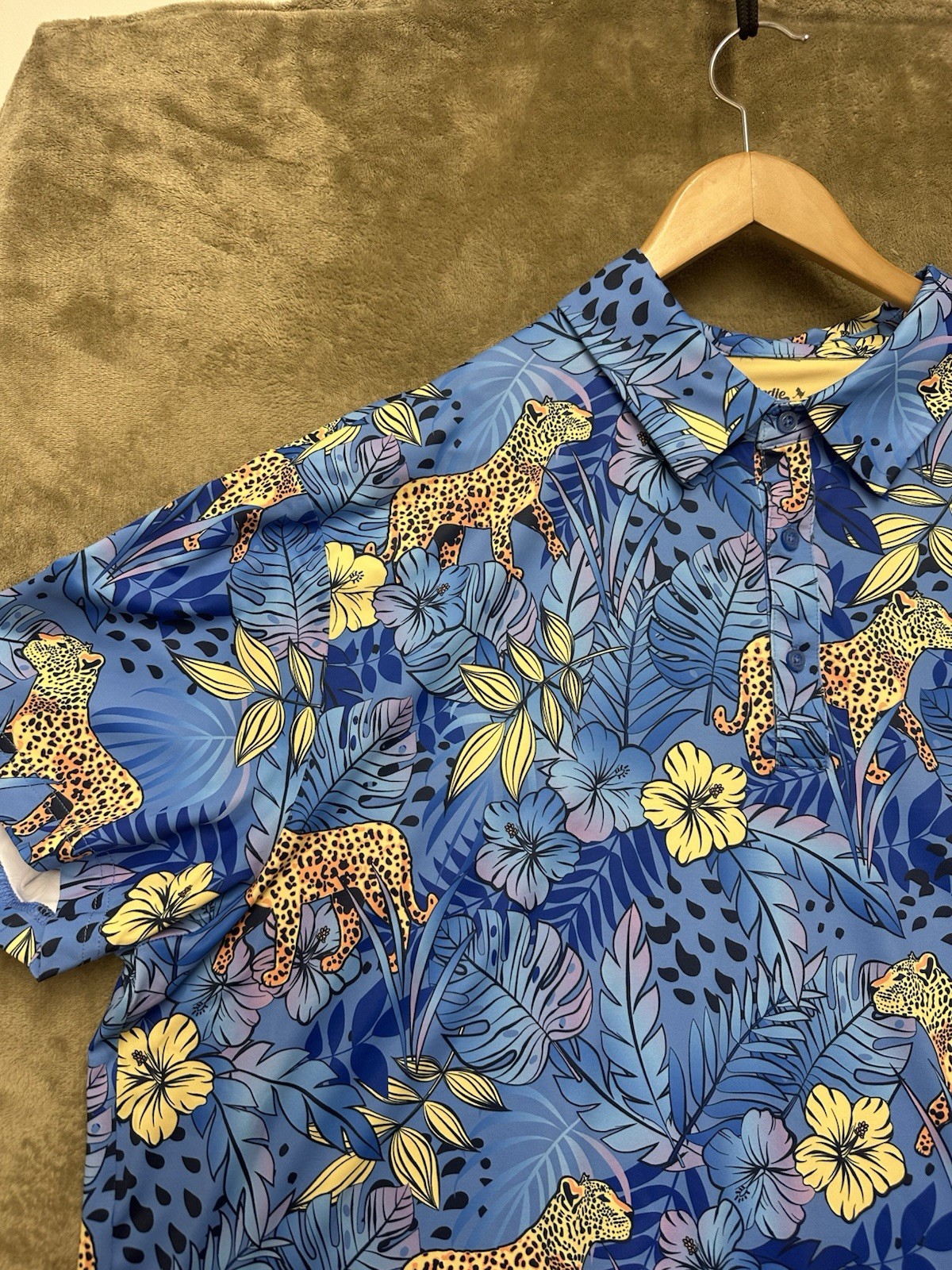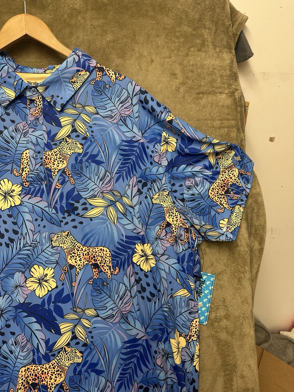как выглядит Birdie Bound Mens Jungle Leopard Azure Blue Printed Golf Polo Shirt Size 3XL фото