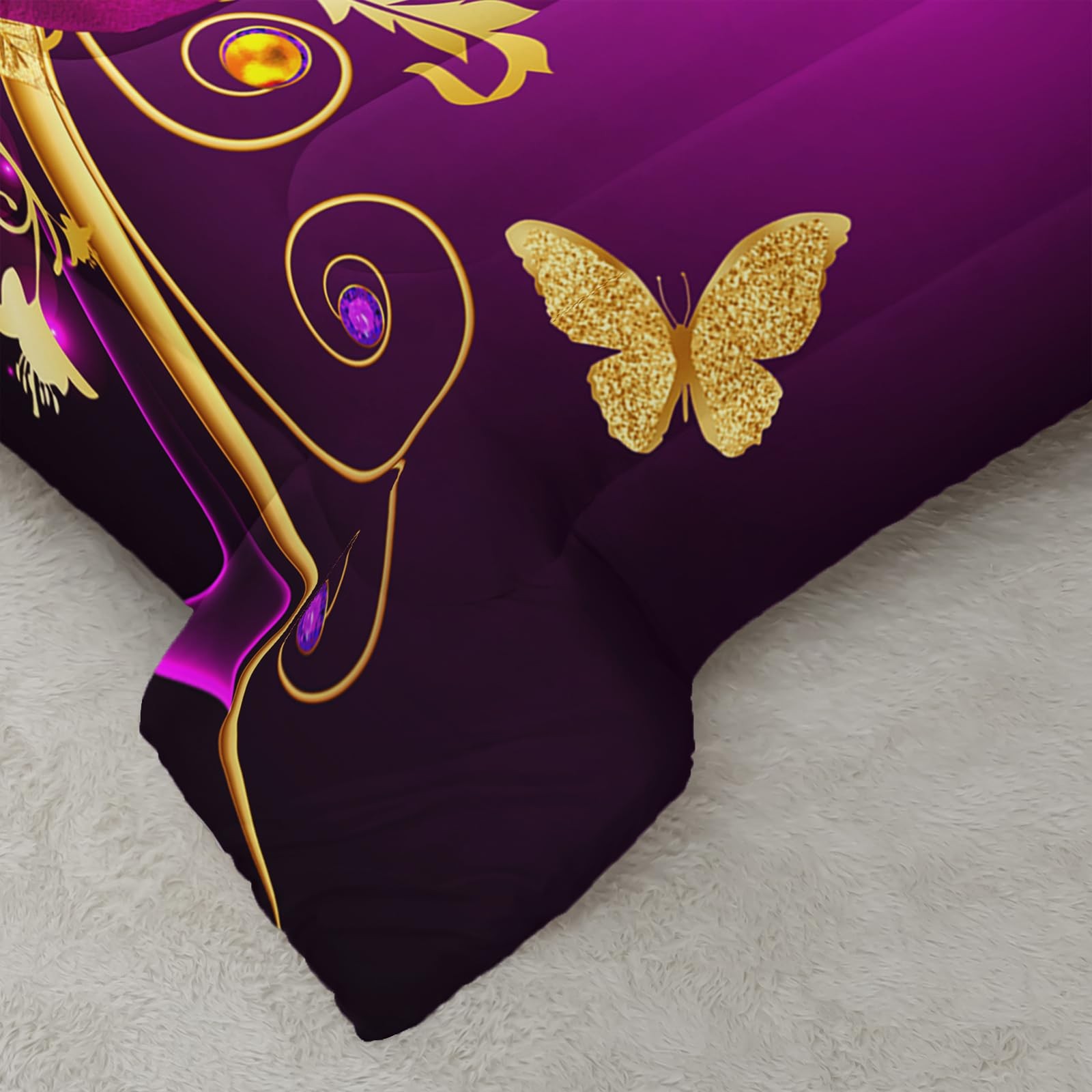 Rose Comforter Set Queen Size, Pink and Gold Floral Butterfly Bedding Set, Ro...