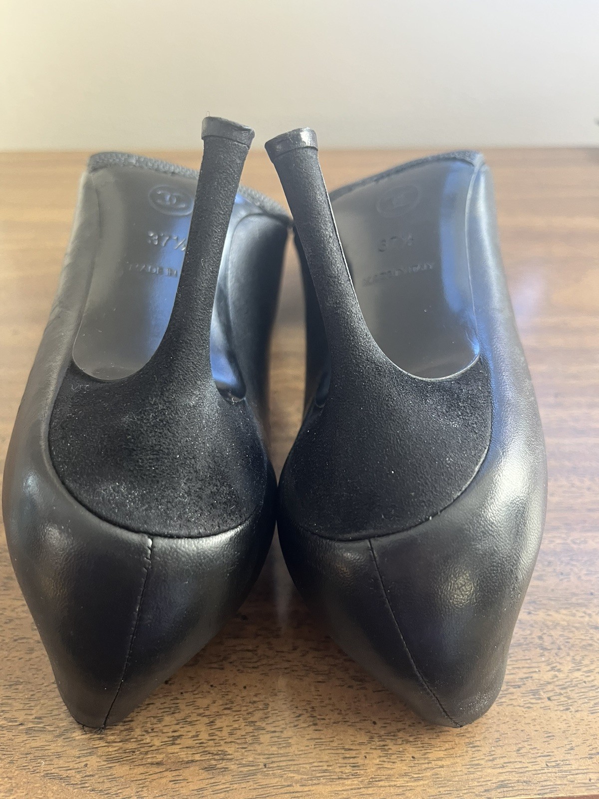 как выглядит Chanel Designer Heels Black Leather Pumps CC Logo Faux Pearl Toe Cap 37.5 / 7.5 фото