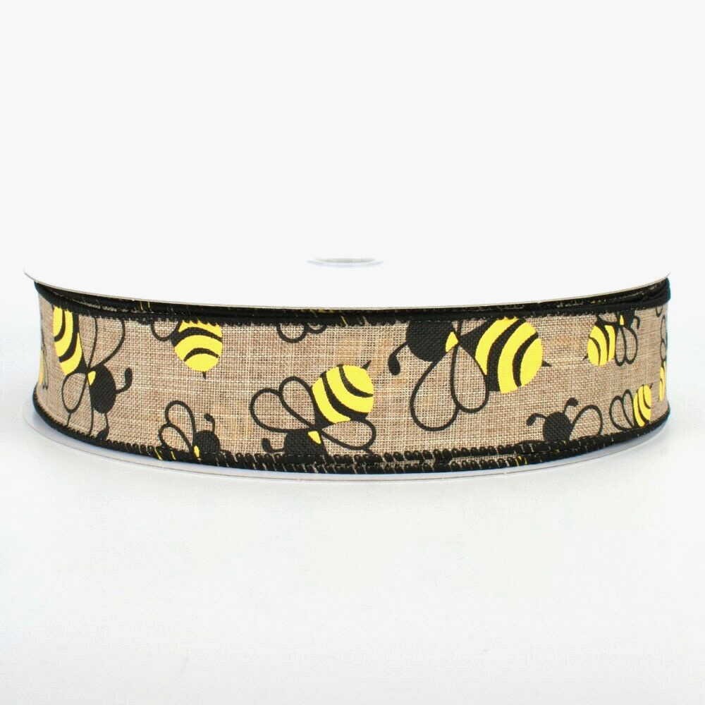 Yellow Black Bumble Bees on Natural 1.5 x 5 yd Wired Ribbon Spring Summer