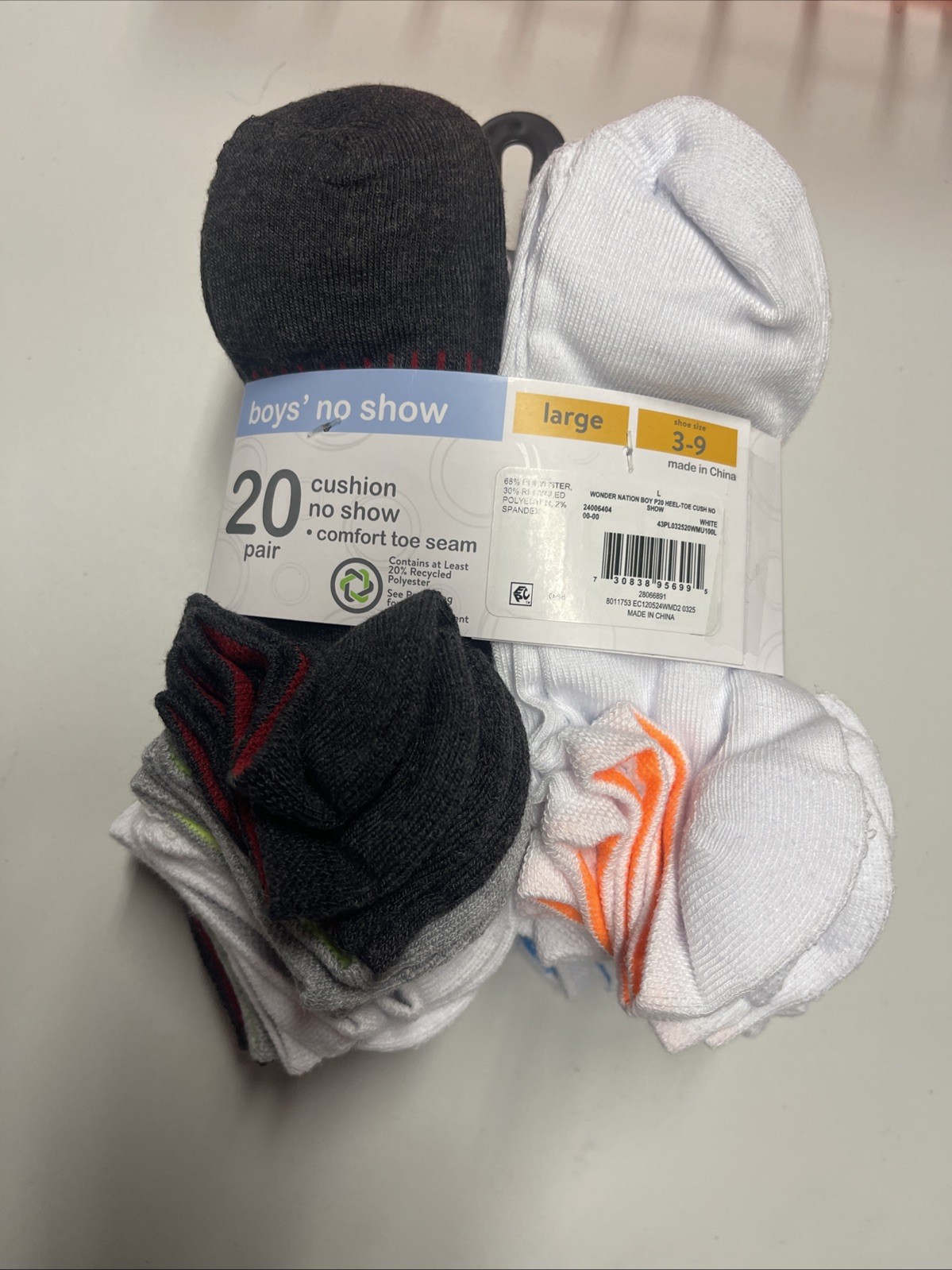 Wonder Nation No Show Cushion Socks 20 Pair Large 3-9 Boys New