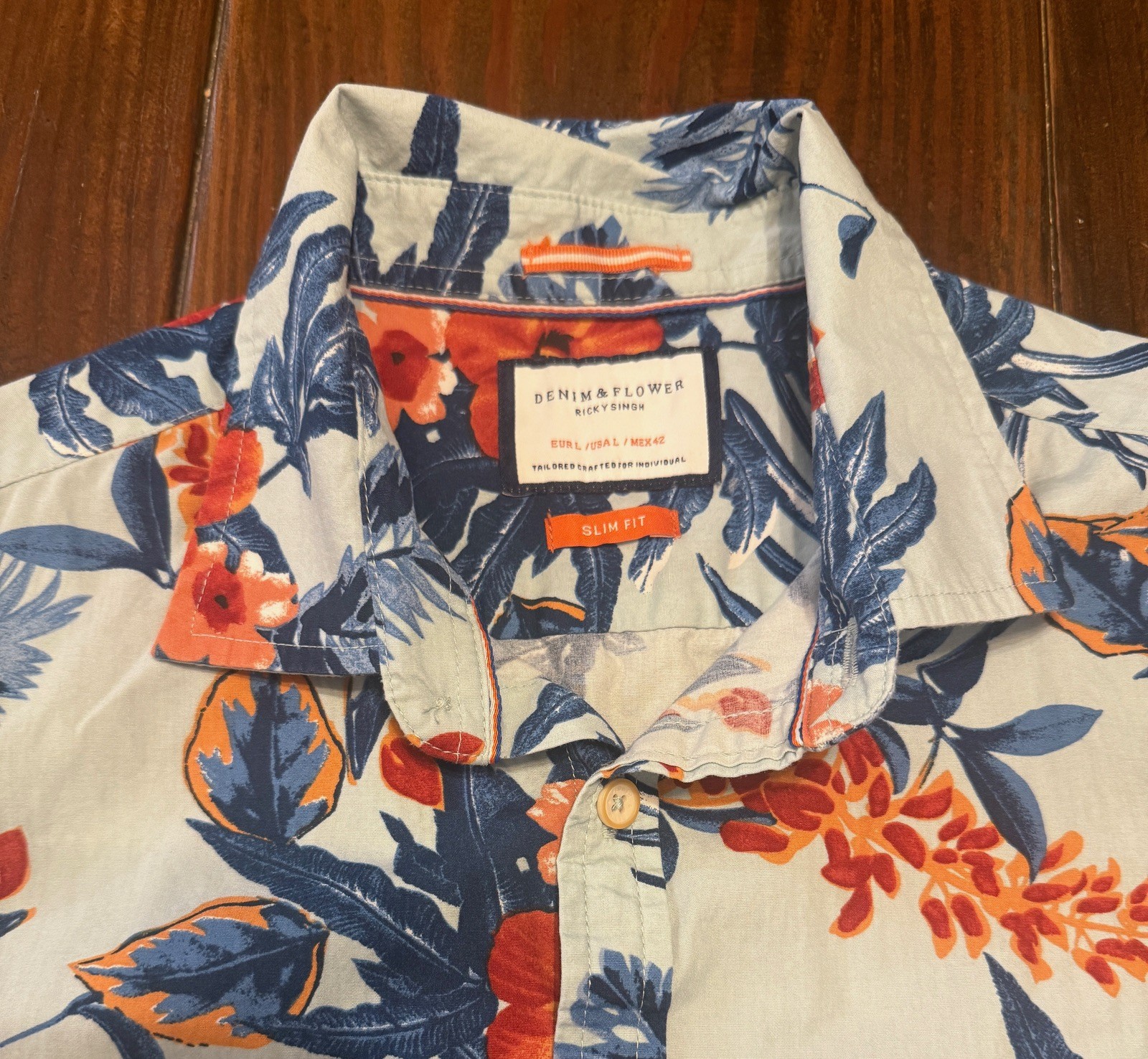 Mens Denim Flower Ricky Singh Blue Floral Hawaiian Shirt Slim Fit Large