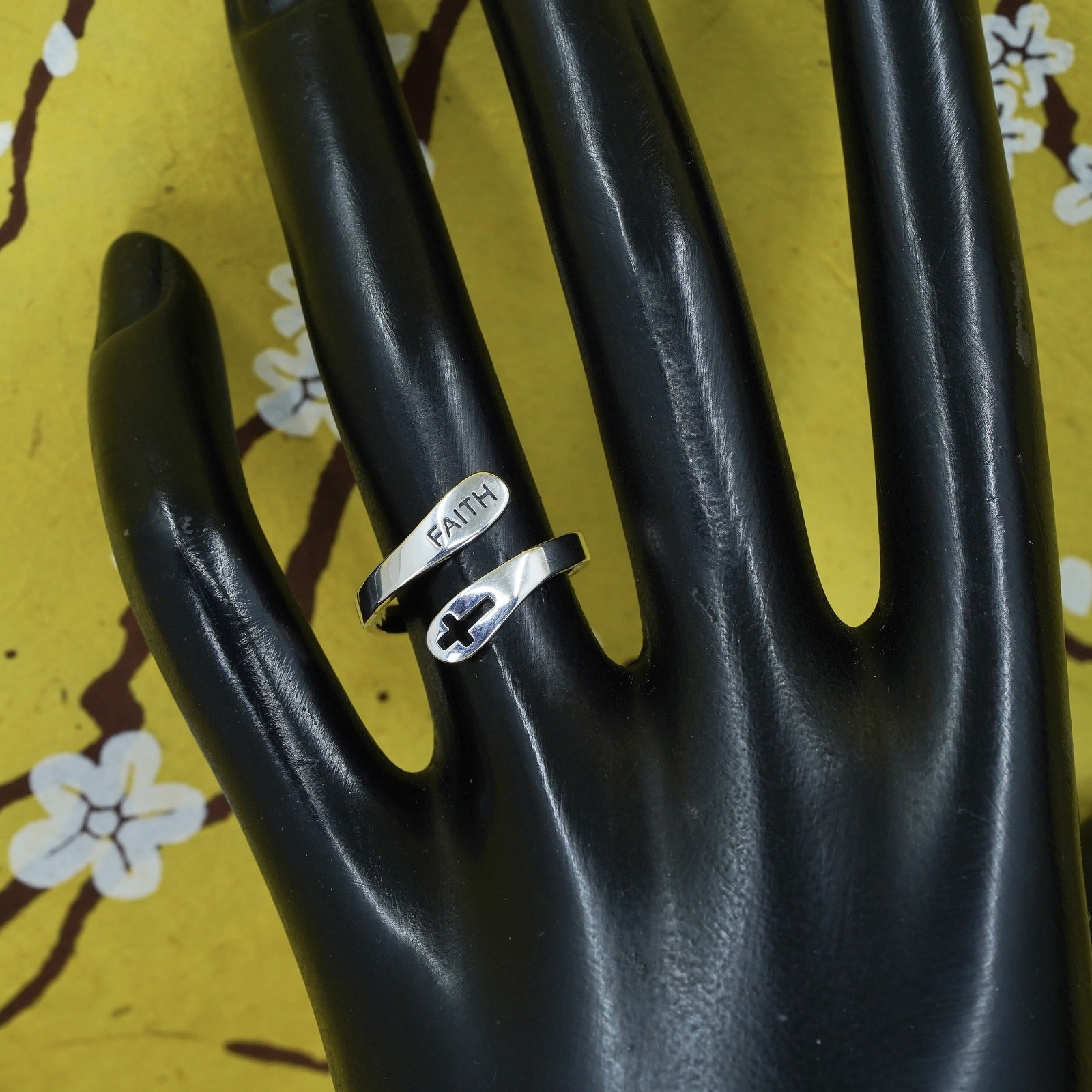 Size adjustable, vtg Sterling silver wrap band, 925 cross ring embossed faith