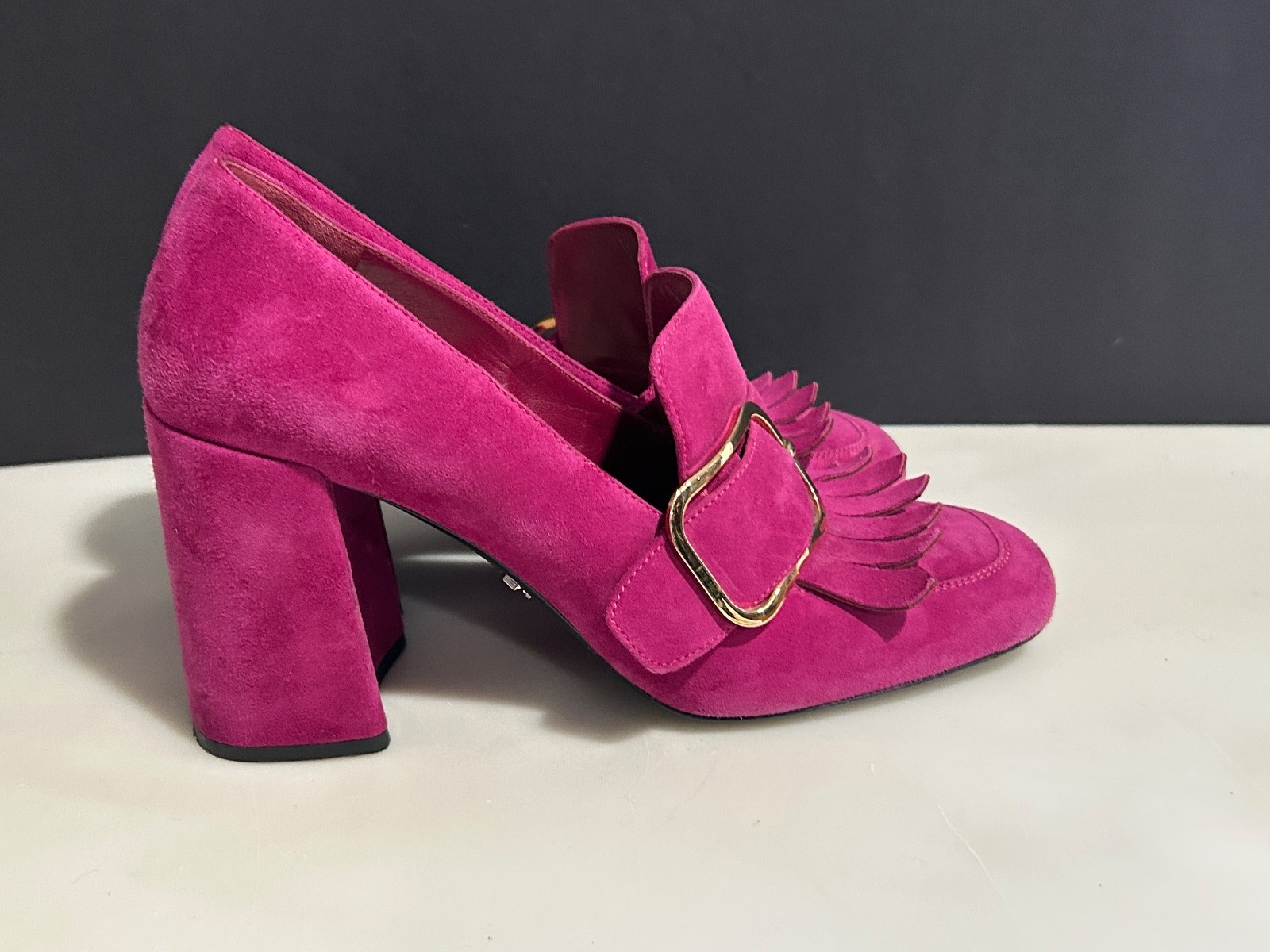 PRADA Size 38.5 or 8.5 US Pink Suede Buckle Kiltie Pumps Worn Once Excellent