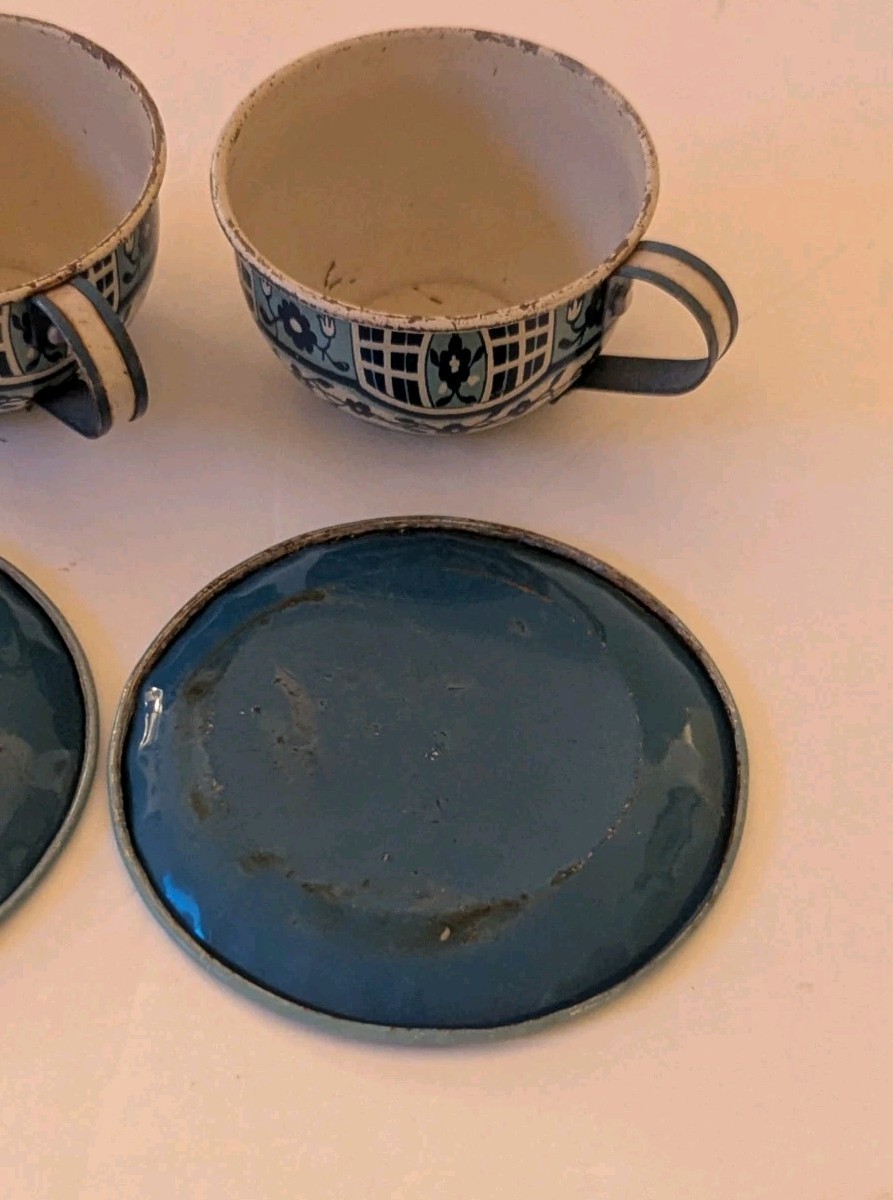 Child Tea Set Wolverine Blue Delft 4 Pieces Holland USA Tin Litho Teacups 1940s