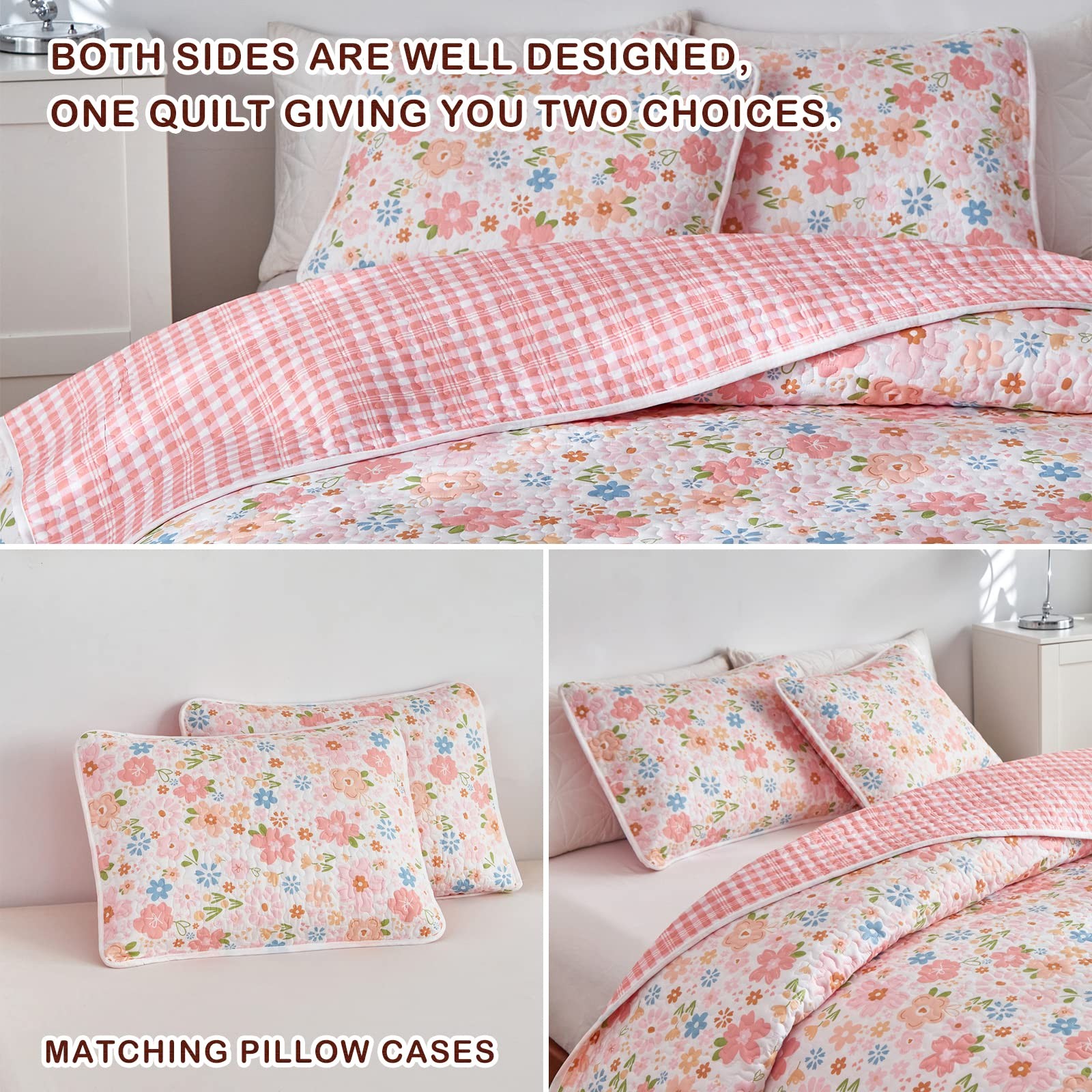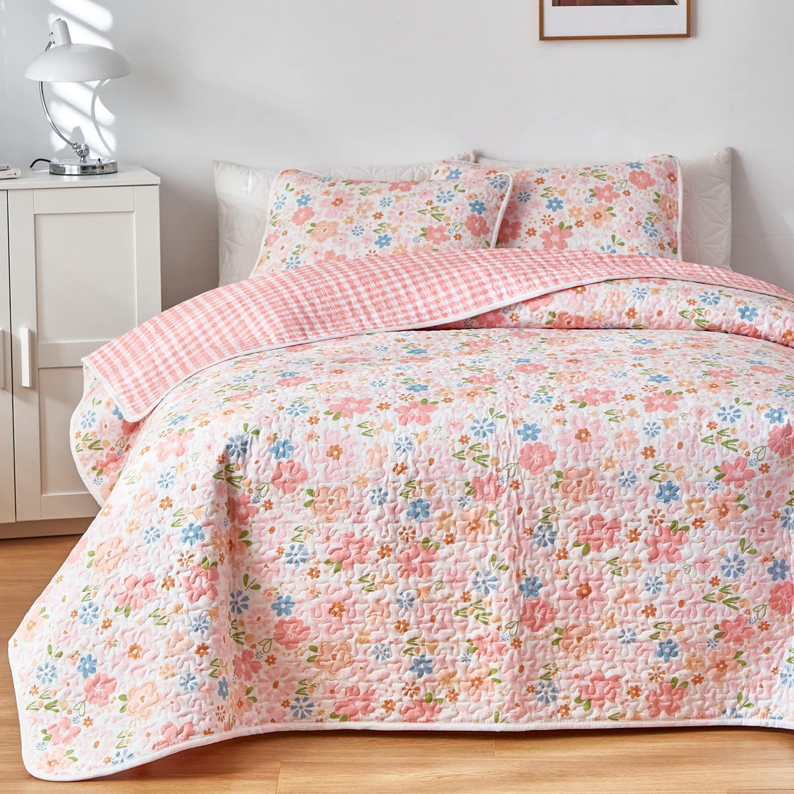 2 Pieces Cotton Quilt Set for Girls, Twin Size Floral Pink Flowers Design, Co...