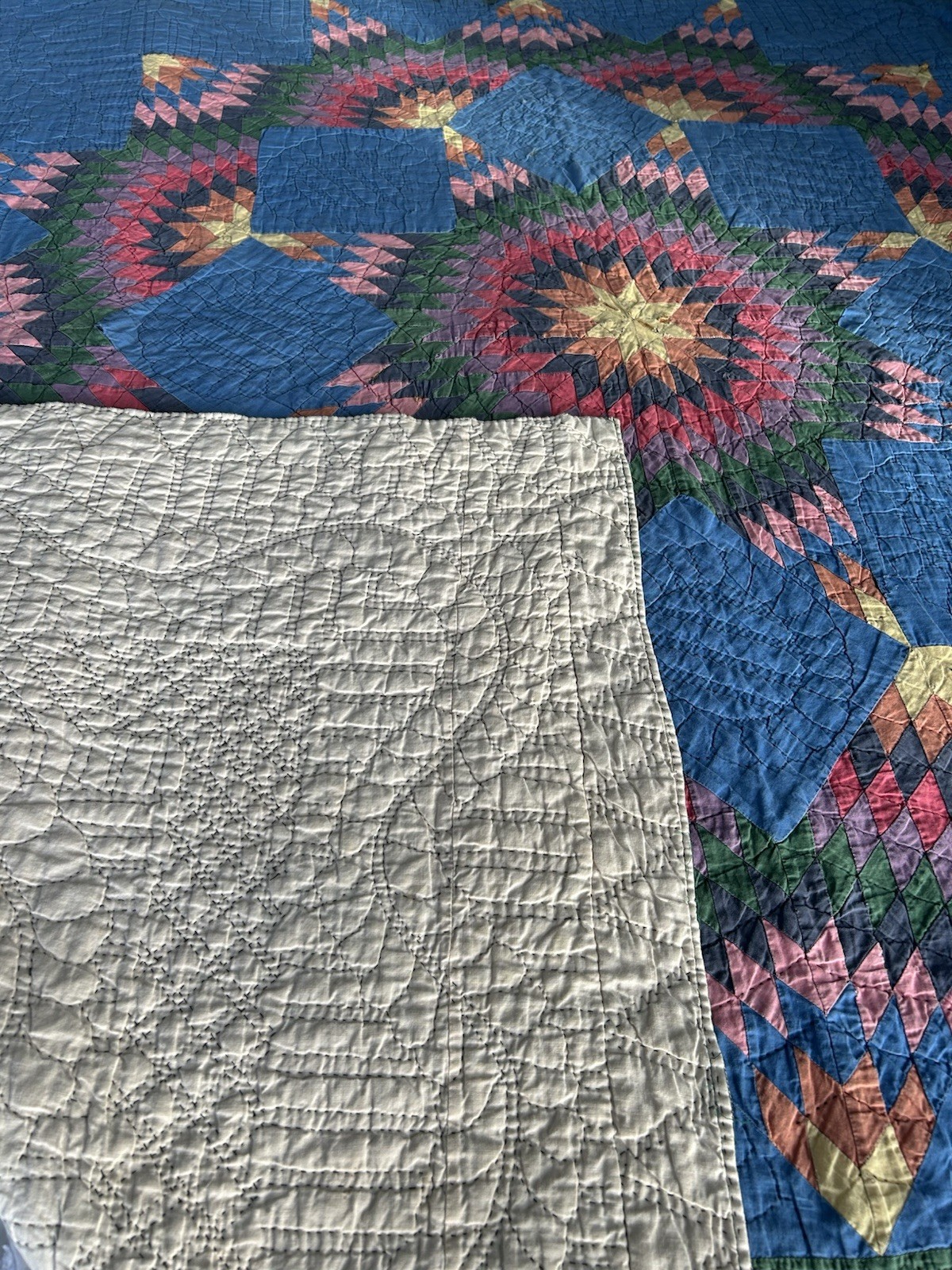 Hand-stitched quilt with 'Star' pattern in blue, pink, yellow, and green cotton