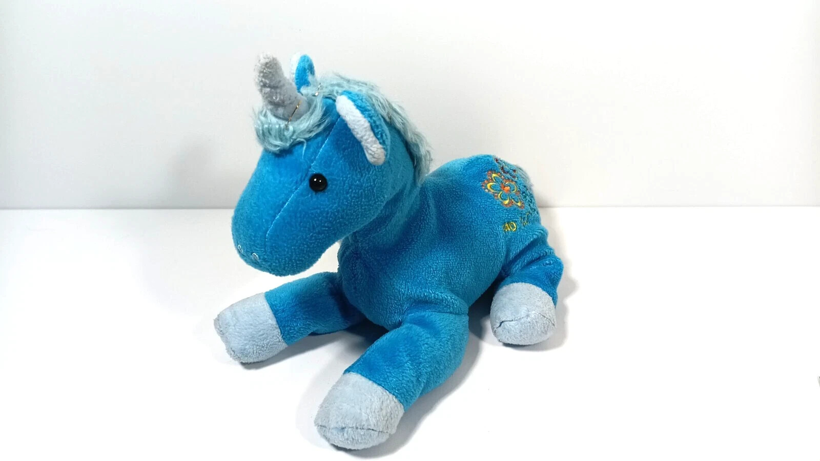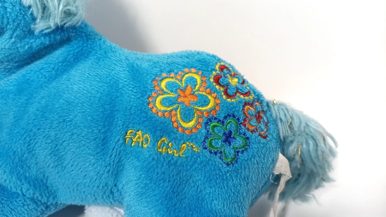 FAO Schwarz Blue Unicorn Plush Stuffed Animal Toy Embroidered Floral Girl