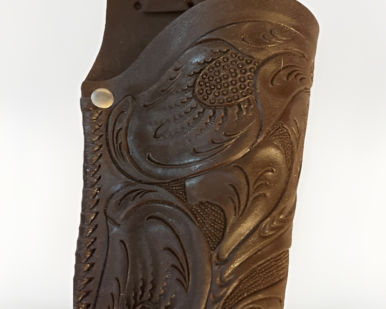 как выглядит Mattel Fanner Cap Gun Holster Faux Brown Tooled Leather Great Condition фото