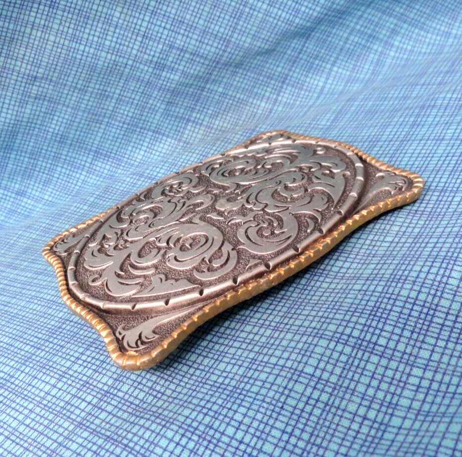 Cowboy Belt Buckle Western Floral Scroll Rodeo Bull Storming Silver Vtg .SHY207