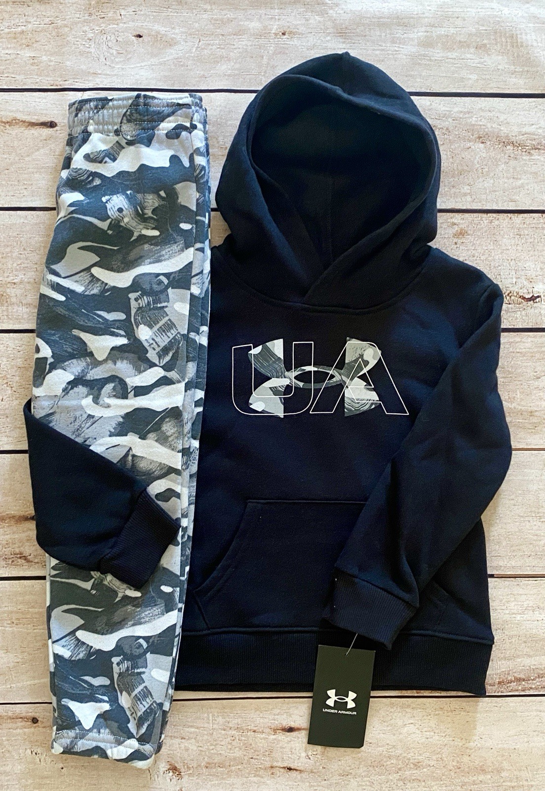 как выглядит Under Armour Boys Black Gray Camo Sweatsuit Hoodie Sweatpants Size 4T NWT фото