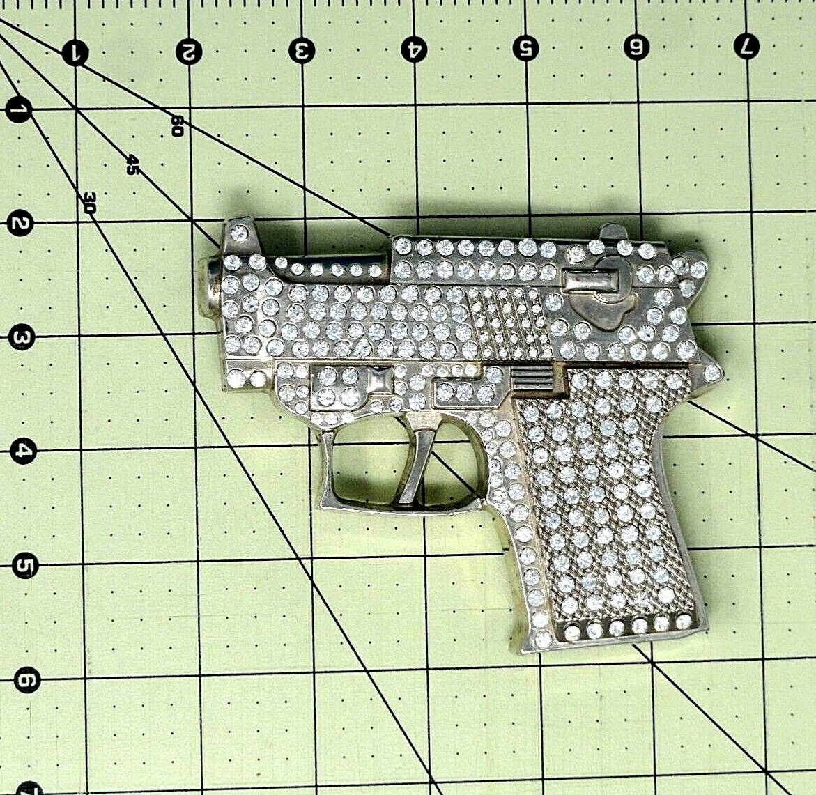 Pistol Bling Belt Buckle Silver Tone Metal Rhinestones Hip Hop Music Vtg .TWY080