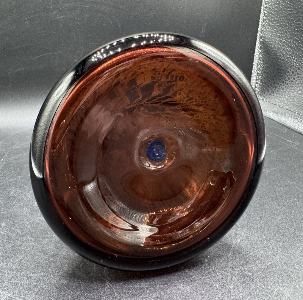 как выглядит Robert Coleman Hand Blown Art Glass Vase Black Amethyst Peacock Iridescent Vtg фото