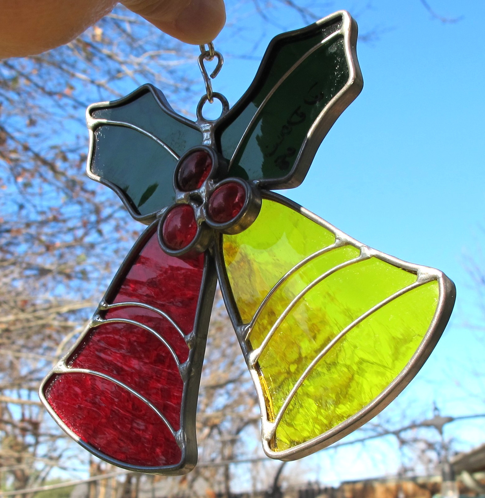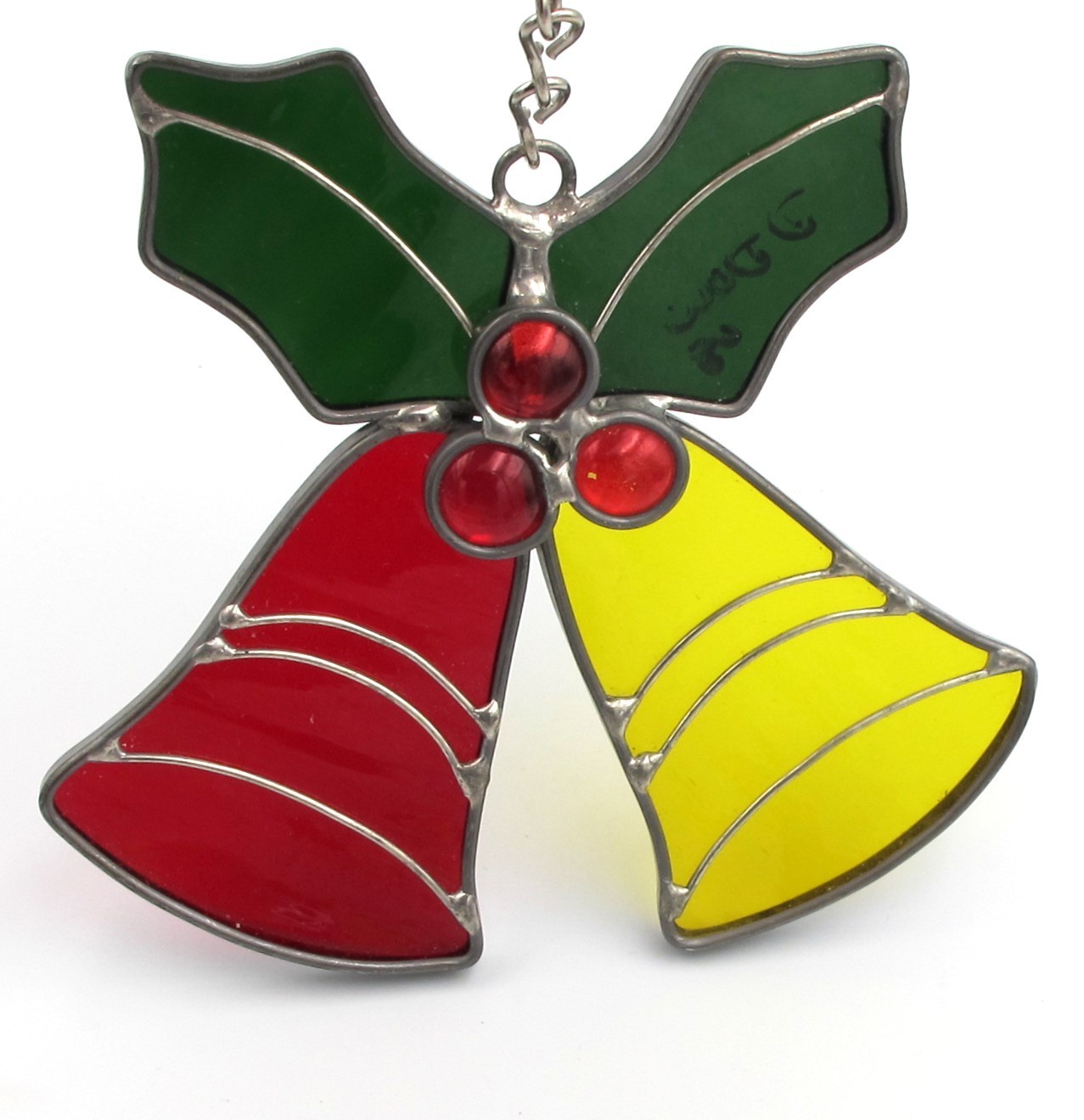 VINTAGE Leaded STAINED GLASS BELLS HOLLY CHRISTMAS Suncatcher Ornament 5.25W C4