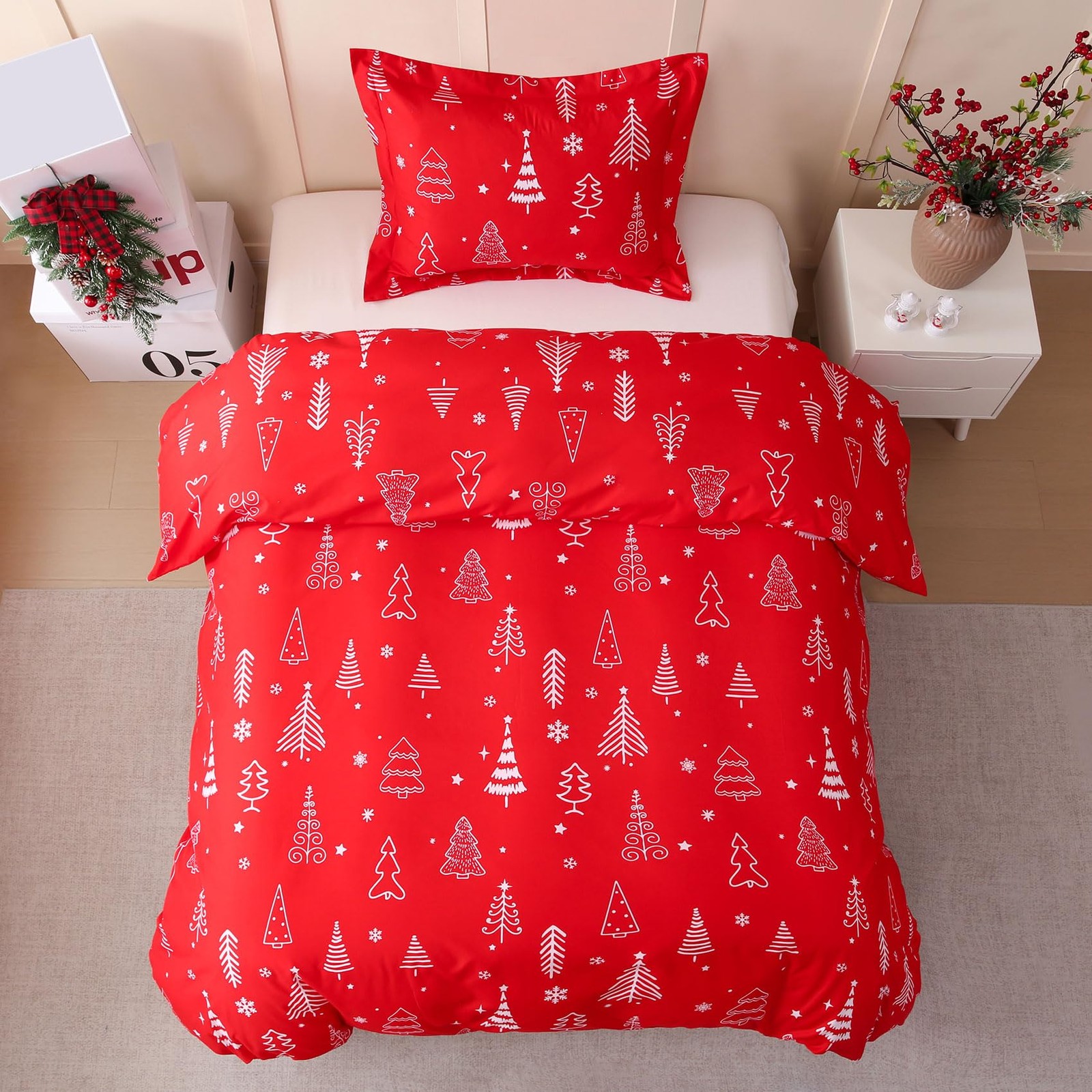 Red Christmas Tree Kids Duvet Cover Set Twin Size, 2 Piece Xmas Comforter Cov...