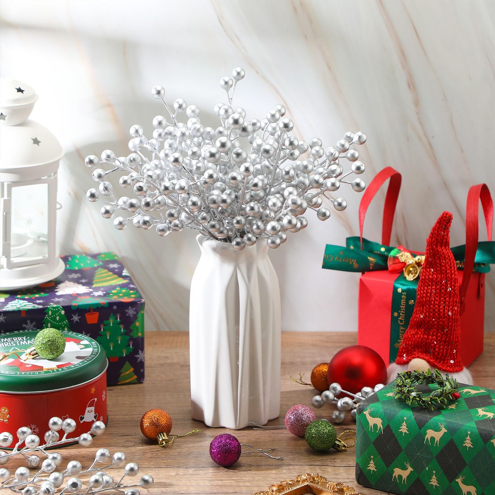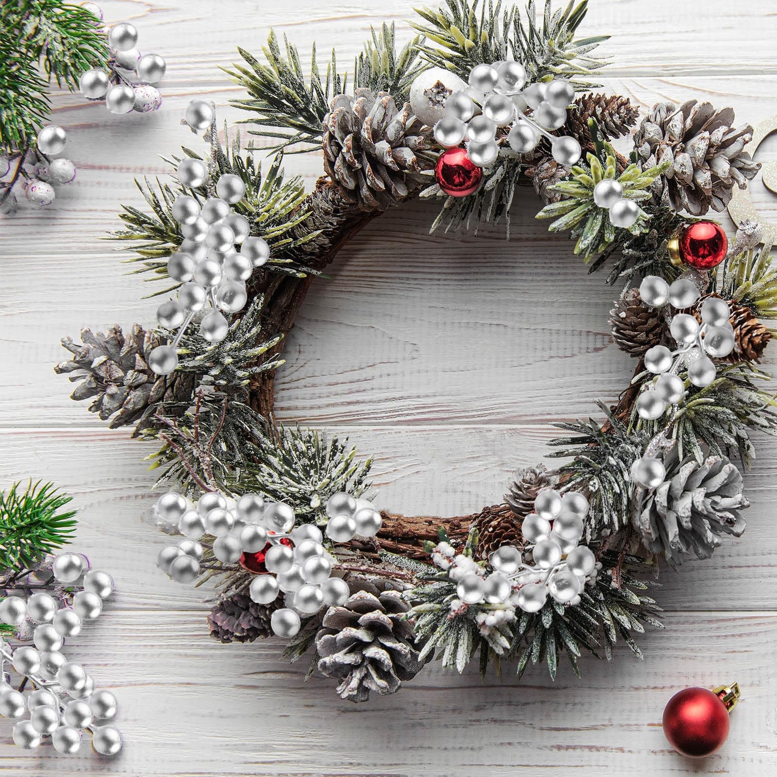 как выглядит 50 Pieces Artificial Holly Berry Stem Picks with Snowflake Frosted Christmas ... фото
