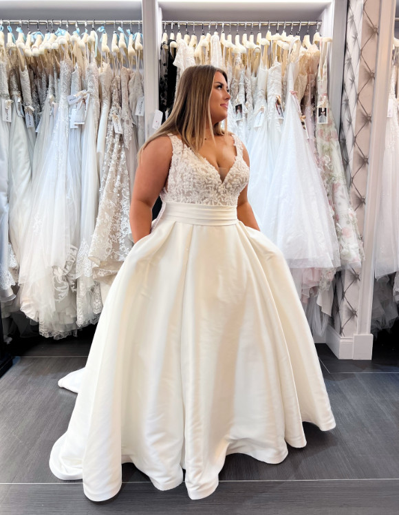 Plus Size Wedding Dress With Side Pockets V Neck A Line Bridal Gown Sweep Train