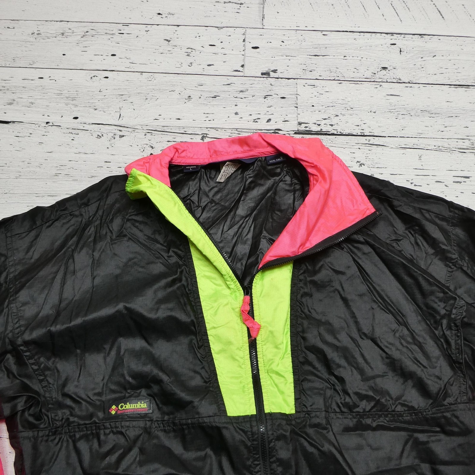 Vintage Columbia Jacket Womens Large Black Neon Nylon Windbreaker Colorblock 90s