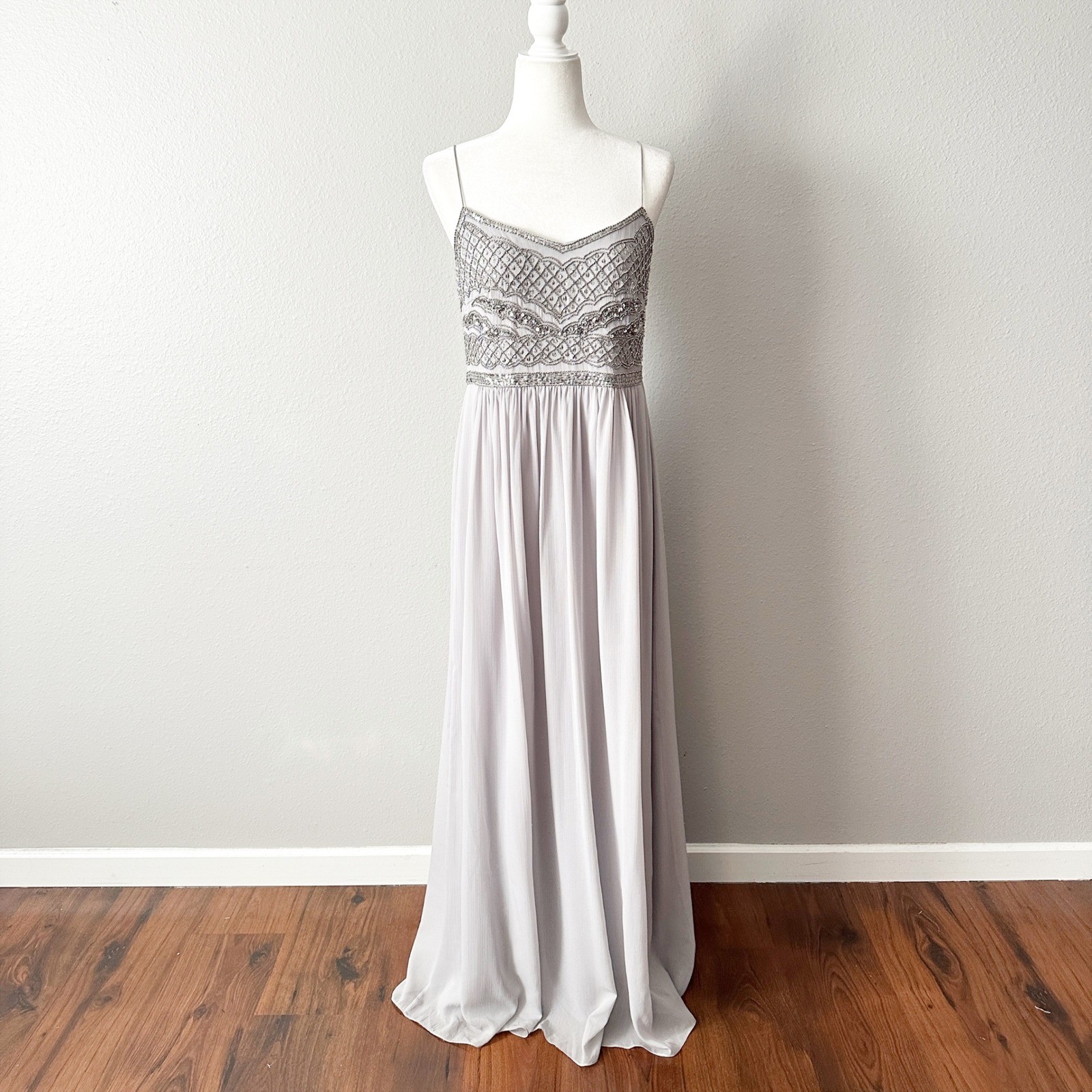 Adrianna Papell Silver Embellished Beaded Spaghetti Strap Formal Dress Size 10