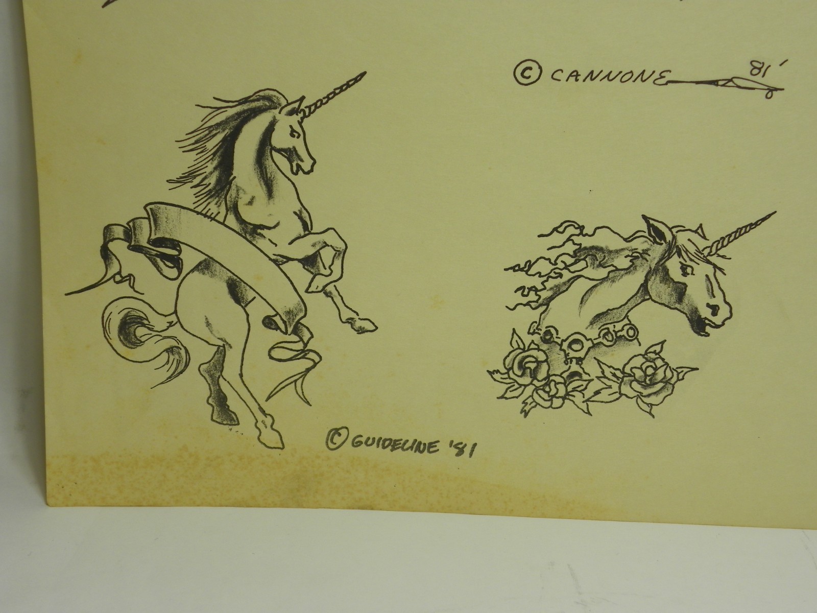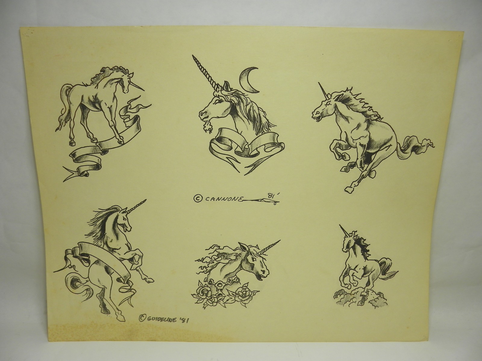 Vintage 1981 Guideline tattoo supply Unicorns tattoo flash. Fair condition.