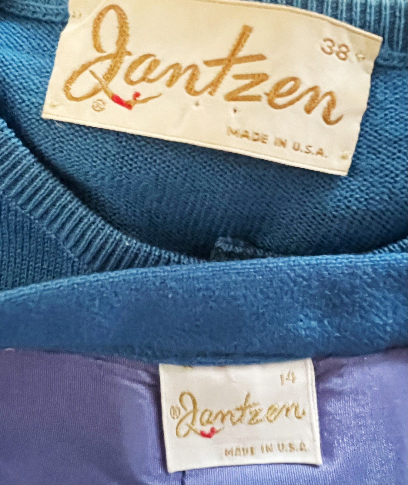 как выглядит Vintage JANTZEN Sweater Wool Bl. Skirt Set Sz M/L Blue Button Up Cardigan 1960s фото