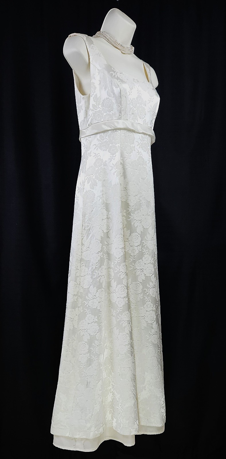 Vtg 60s White brocade rosette Empire Waist Wedding Gown Dress floral train