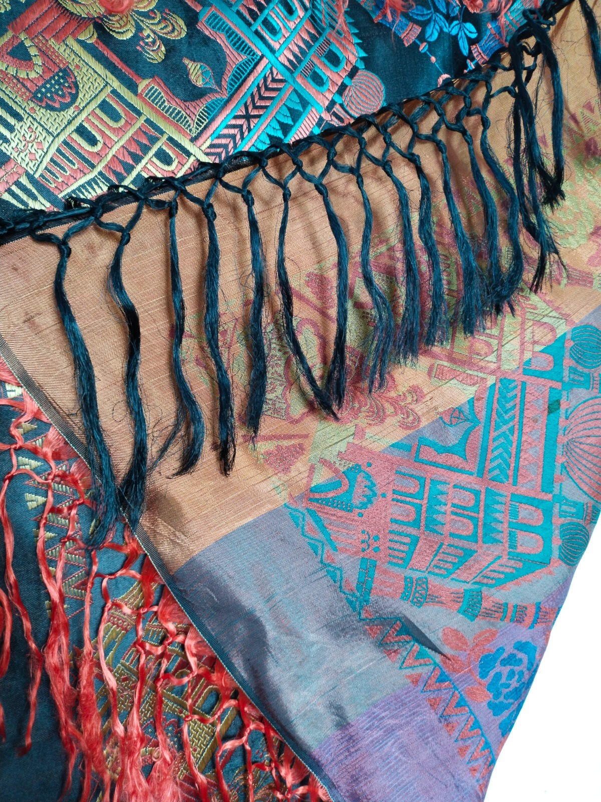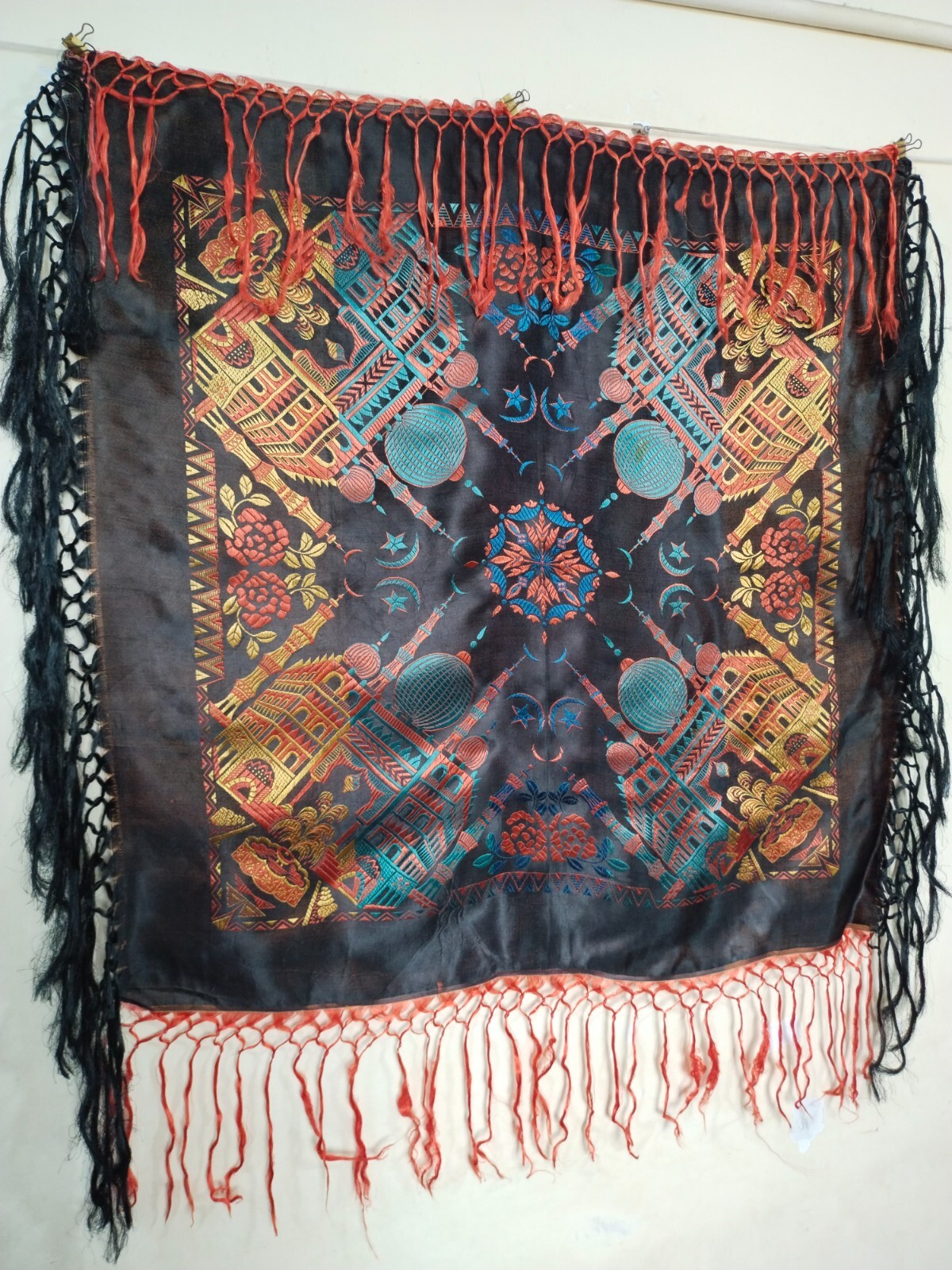 vintage silk satin piano taj mahal shawl fringes scarf WWII brocade woven wrap