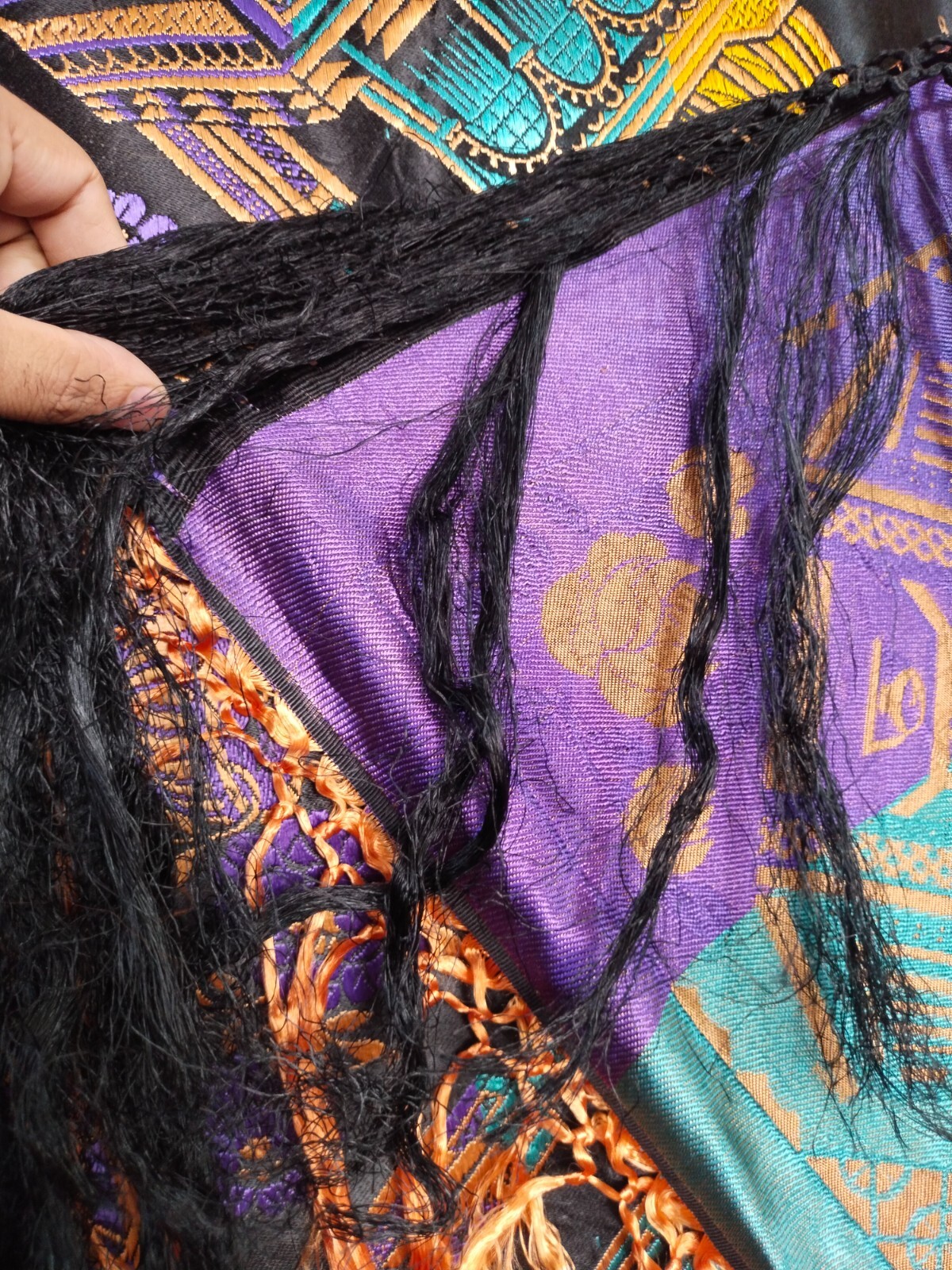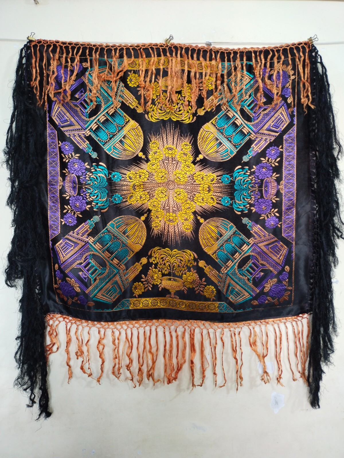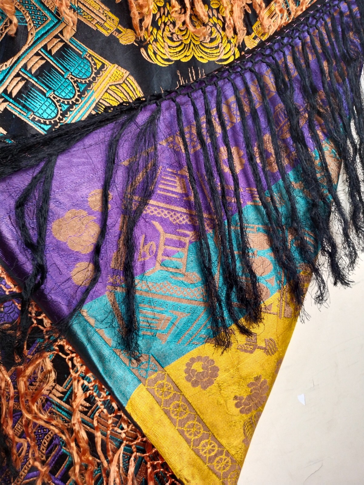 как выглядит vintage WWII silk satin piano taj mahal shawl fringes scarf brocade woven wrap фото