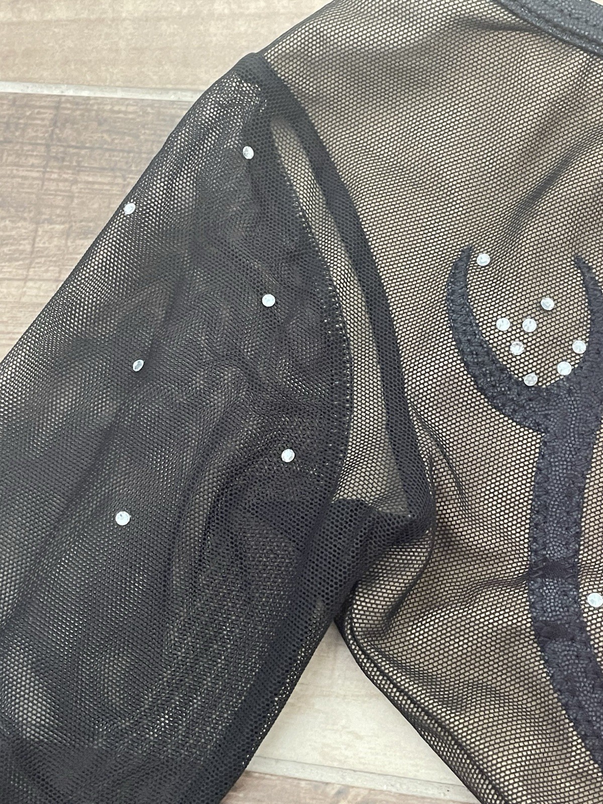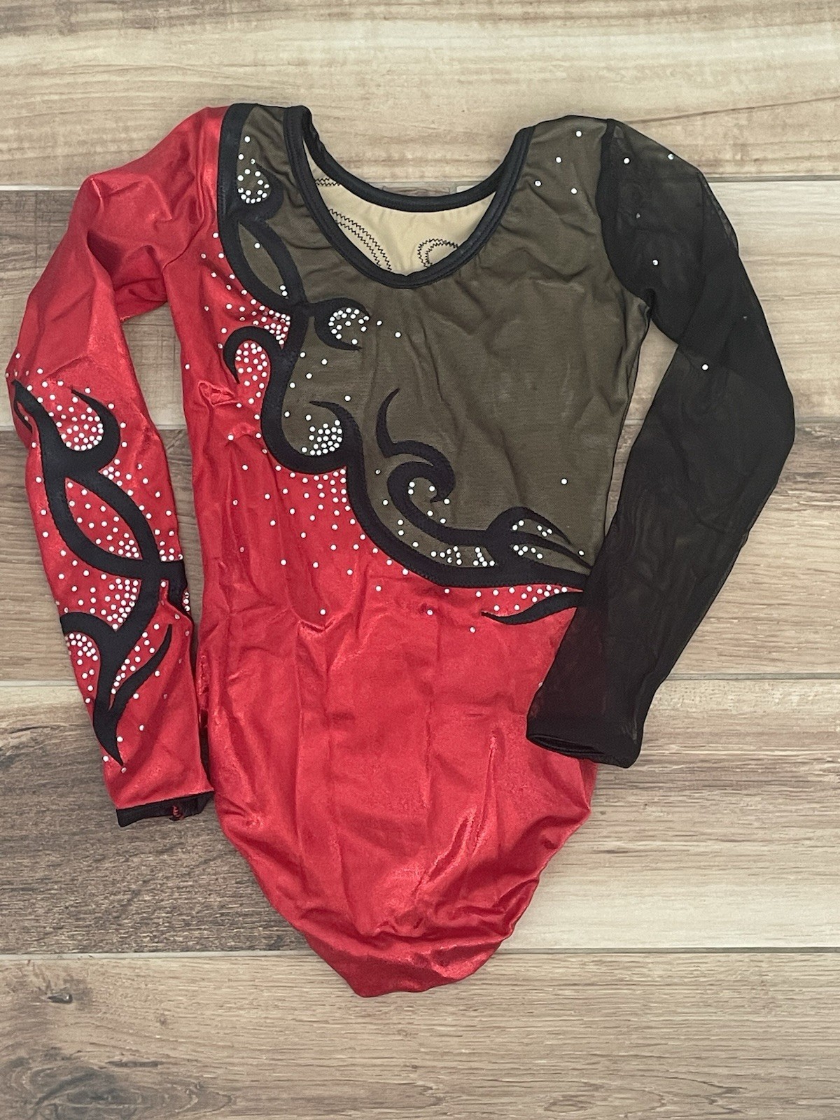 Gymnastics Competition Leotard Long Mesh Sleeves Foil Rhinestones Child 10-12