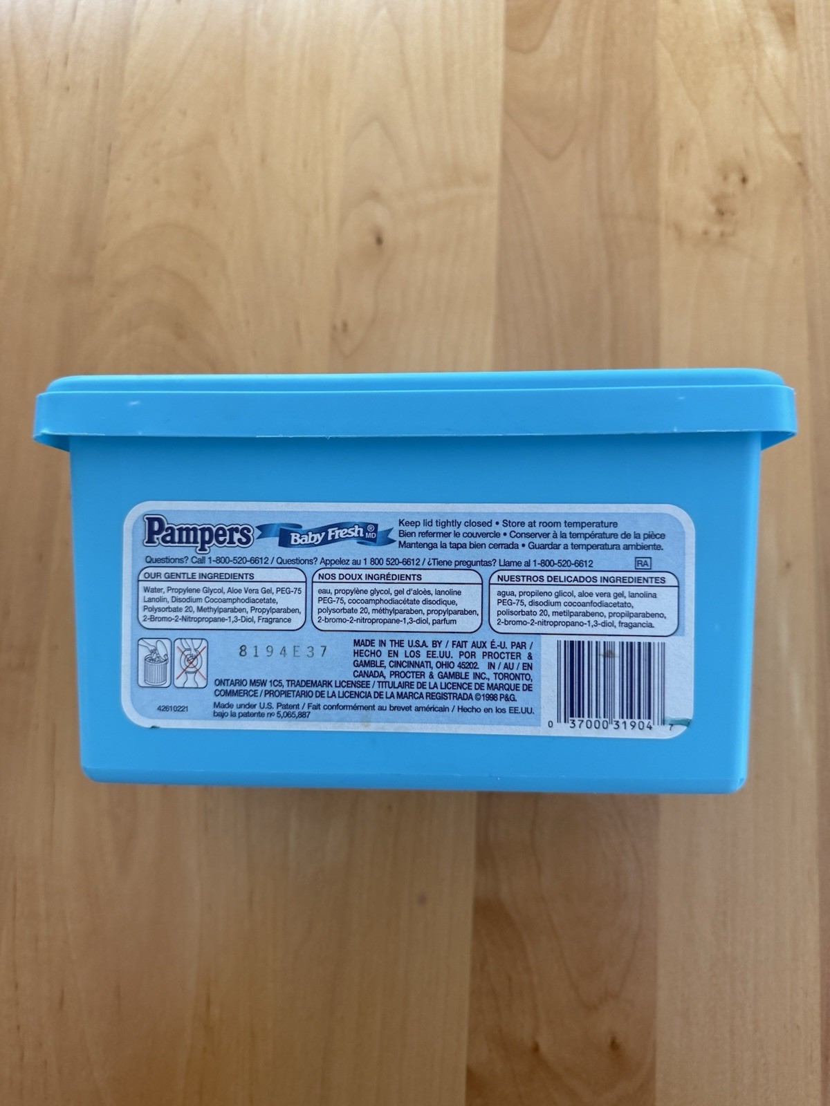 VTG 1998 Pampers Baby Wipes Container Baby Fresh Aloe Blue Empty prop Read Ad