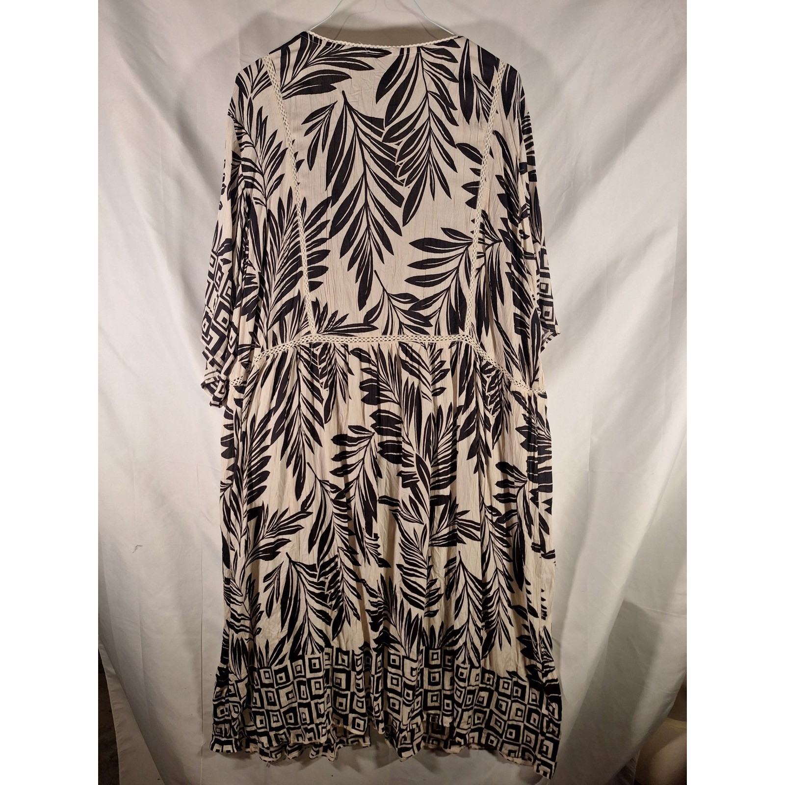ANGIE Kimono Cardigan Duster Long Sleeve Tropical Leaf Print Black White 1X